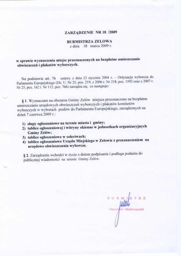| Tytuł aktu prawnego - skrócony: | Zarządzenie w sprawie wyznaczenia miejscprzeznaczonych na bezpłatne umieszczanie obwieszczeń i plakatów wyborczych |