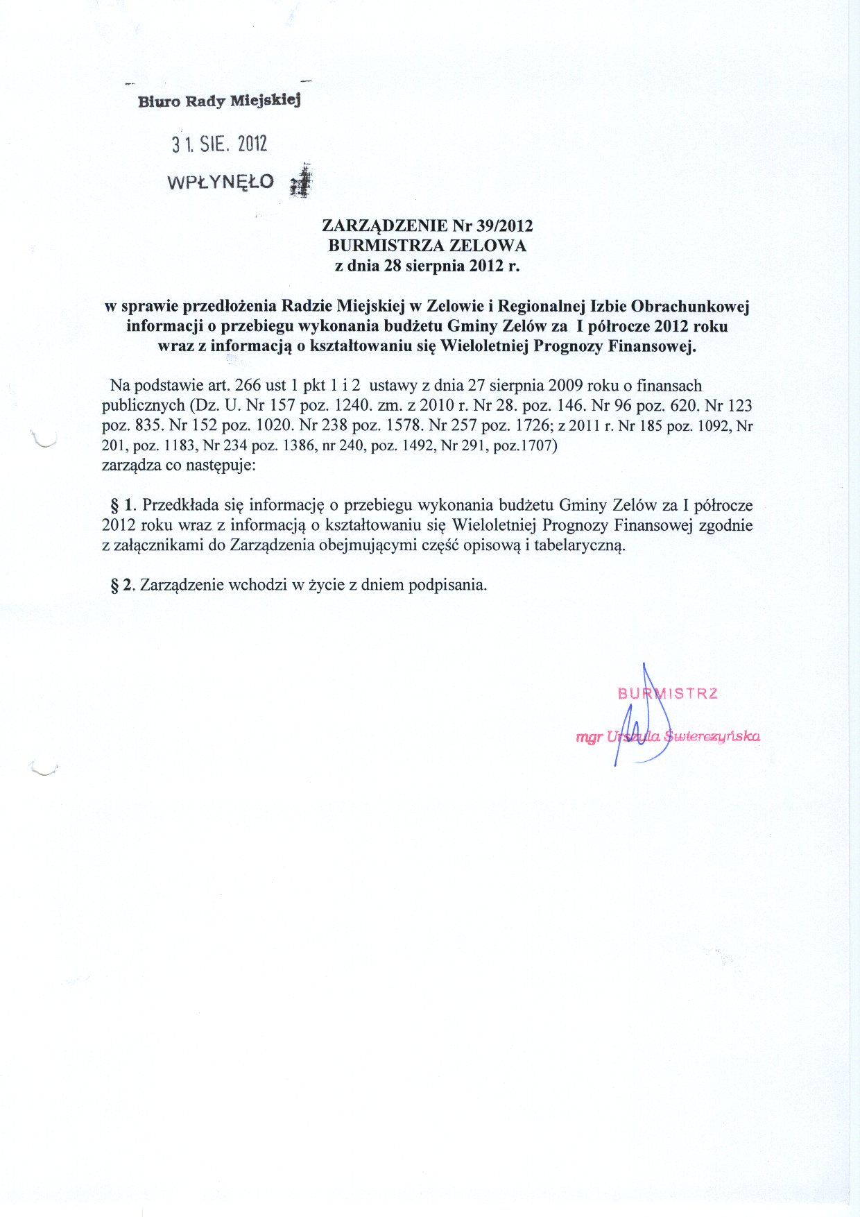 | Tytuł aktu prawnego - skrócony: | w sprawie przedłożenia Radzie Miejskiej w Zelowie i Regionalnej Izbie Obrachunkowej informacji o przebiegu wykonania budżetu Gminy Zelów za I półrocze 2012 roku wraz z informacją o kształtowaniu się Wieloletniej Prognozy Finansowej. |