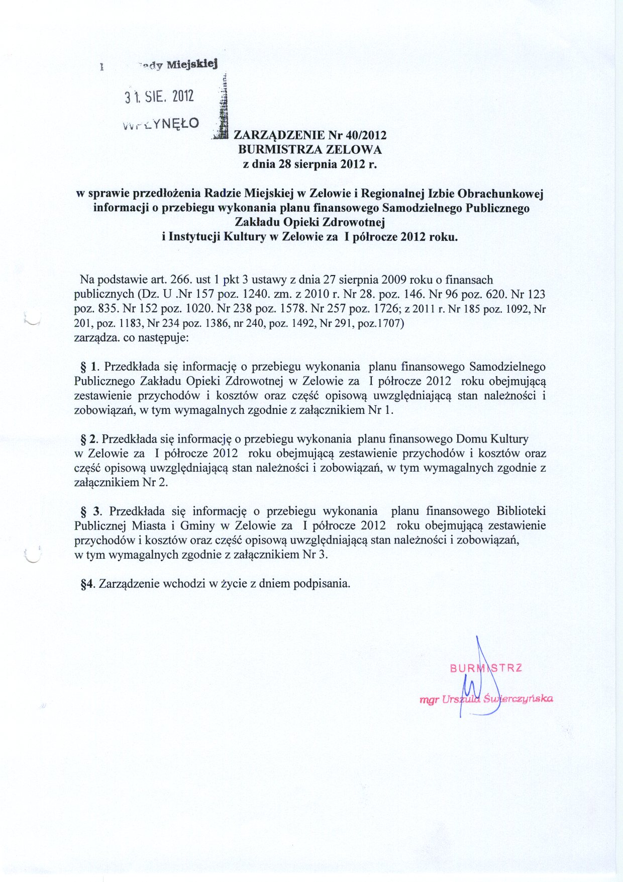 | Tytuł aktu prawnego - skrócony: | w sprawie przedłożenia Radzie Miejskiej w Zelowie i Regionalnej Izbie Obrachunkowej informacji o przebiegu wykonania planu finansowego Samodzielnego Publicznego Zakładu Opieki Zdrowotnej i Instytucji Kultury w Zelowie za I półrocze 2012 roku |