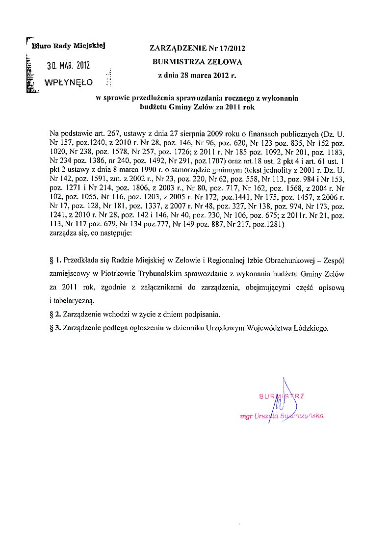 | Tytuł aktu prawnego - skrócony: | w sprawie przedłożenia sprawozdania rocznego z wykonania budżetu Gminy Zelów za 2011 rok |