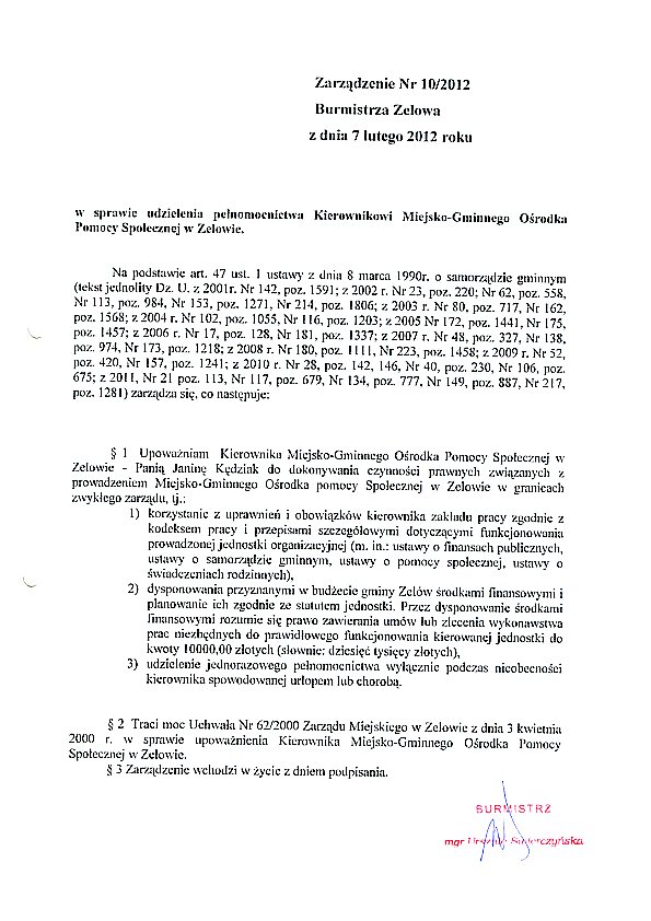 | Tytuł aktu prawnego - skrócony: | w sprawie udzielenia pełnomocnictwa Kierownikowi Miejsko-Gminnego Ośrodka Pomocy Społecznej w Zelowie |