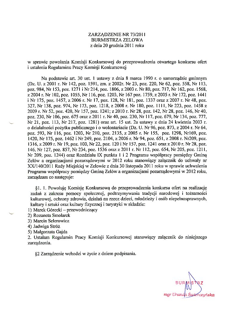 | Tytuł aktu prawnego - skrócony: | Zarządzenie w sprawie powołania Komisji Konkursowej do przeprowadzania otwartego konkursu ofert i ustalenia regulaminu Pracy Komisji Konkursowej |