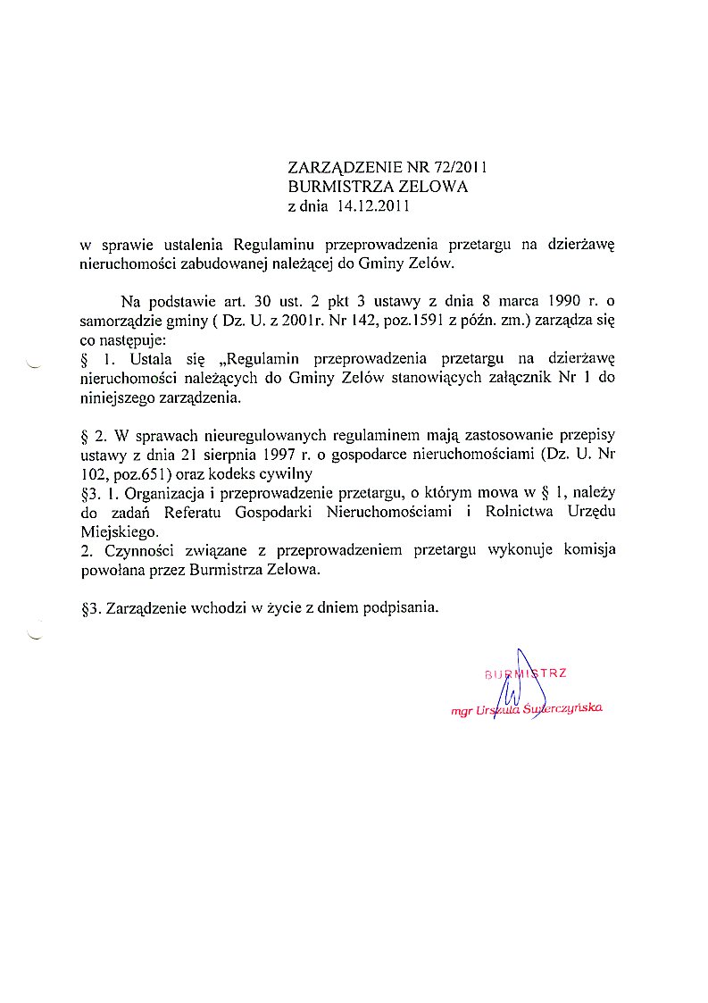 | Tytuł aktu prawnego - skrócony: | Zarządzenie w sprawie ustalenia Regulaminu przeprowadzenia przetargu na dzierżawę nieruchomości zabudowanej należącej do Gminy Zelów. |