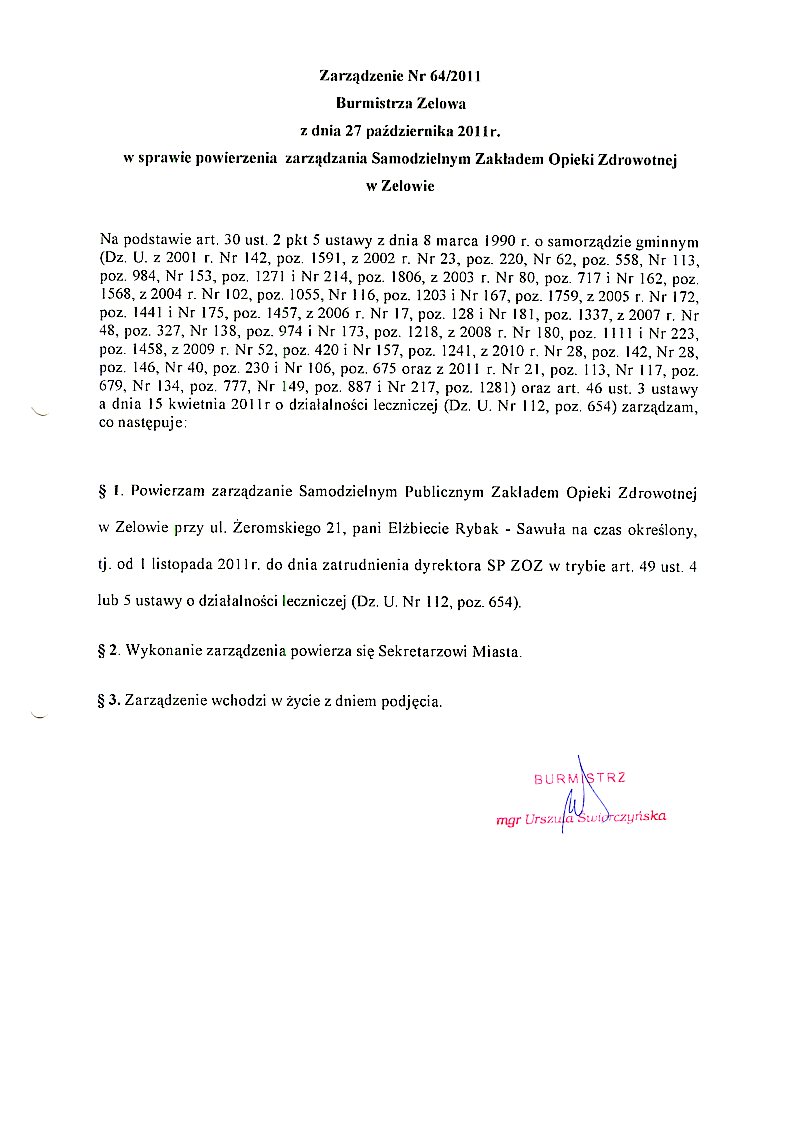 | Tytuł aktu prawnego - skrócony: | Zarzadzenie w sprawie powierzenia zarządzenia Samodzielnym Zakładem Opieki Zdrowotnej w Zelowie |