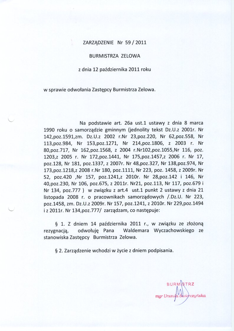 | Tytuł aktu prawnego - skrócony: | Zarządzenie w sprawie odwołania Zastępcy Burmistrza Zelowa |