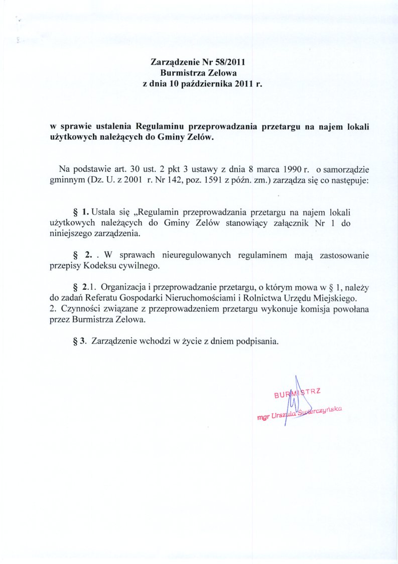 | Tytuł aktu prawnego - skrócony: | Zarządzenie w sprawie ustalenia Regulaminu przeprowadzania przetargu na najem lokali użytkowych należących do Gminy Zelów |