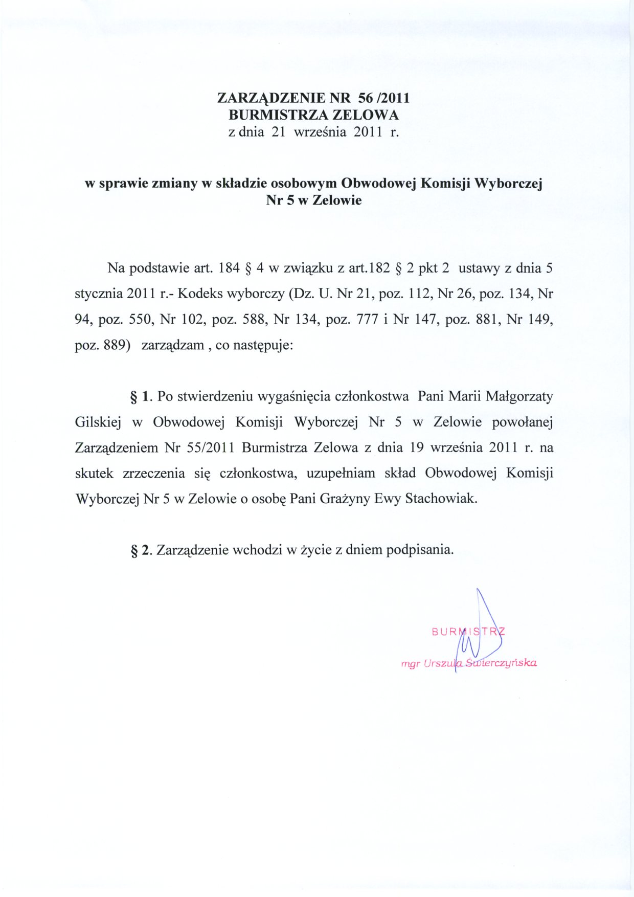 | Tytuł aktu prawnego - skrócony: | Zarządzenie w sprawie zmiany w składzie osobowym Obwodowej Komisji Wyborczej Nr 5 w Zelowie |
