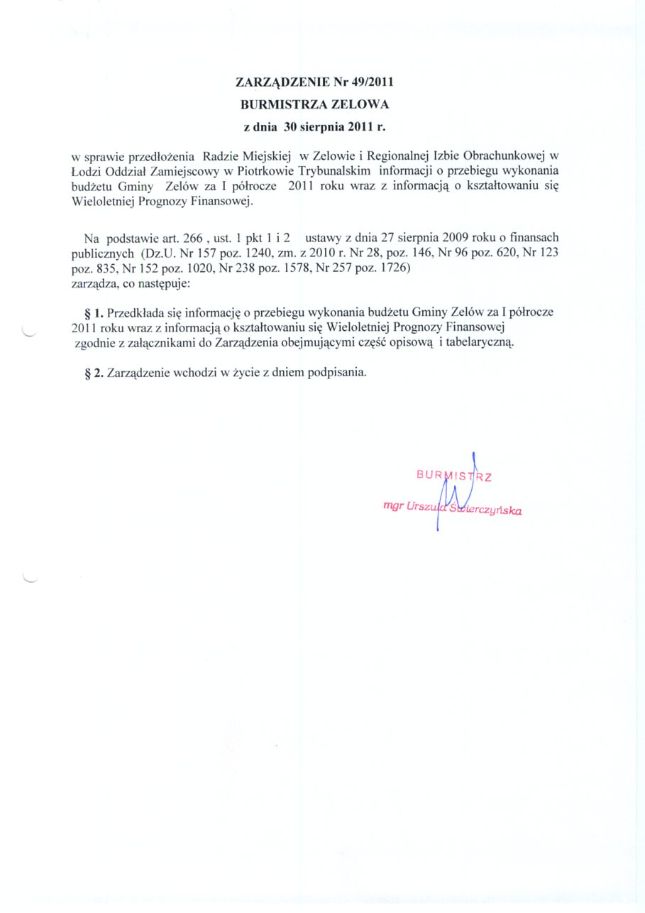 | Tytuł aktu prawnego - skrócony: | Zarządzenie w sprawie przedłożenia Radzie Miejskiej w Zelowie i Regionalnej Izbie Obrachunkowej w Łodzi Oddział Zamiejscowy w Piotrkowie Trybunalskim informacji o przebiegu wykonaia budżetu Gminy Zelów za I półrocze 2011 roku raz z informacją o ksztłatowaniu się Wieloletniej Prognozy Finansowej. |