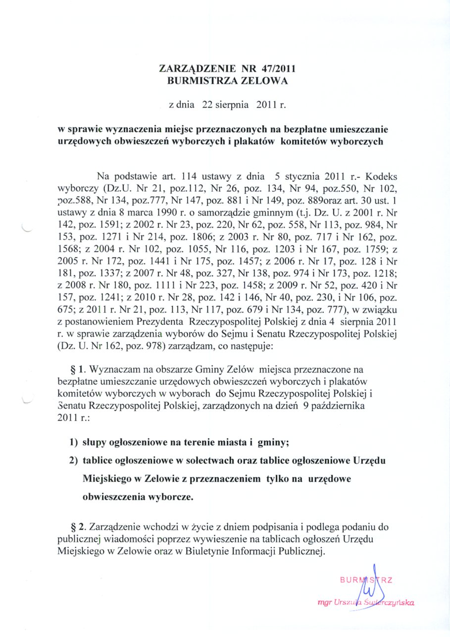 | Tytuł aktu prawnego - skrócony: | Zarządzenie w sprawie wyznaczenia miejsc przeznaczonych na bezpłatne umieszczanie urzędowych obwieszczeń wyborczych i plakatów wyborczych |