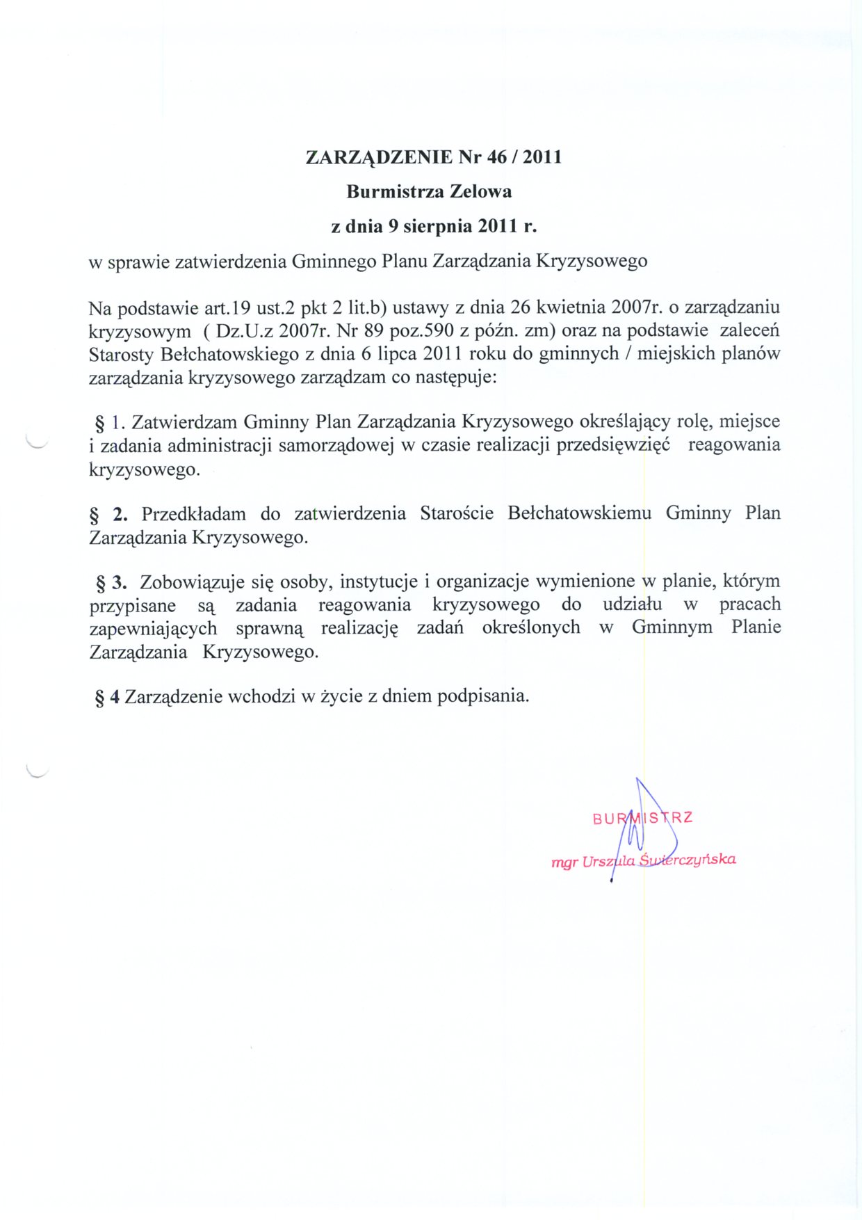 | Tytuł aktu prawnego - skrócony: | Zarządzenie w sprawie zatwierdzenia Gminnego Planu Zarządzania Kryzysowego |