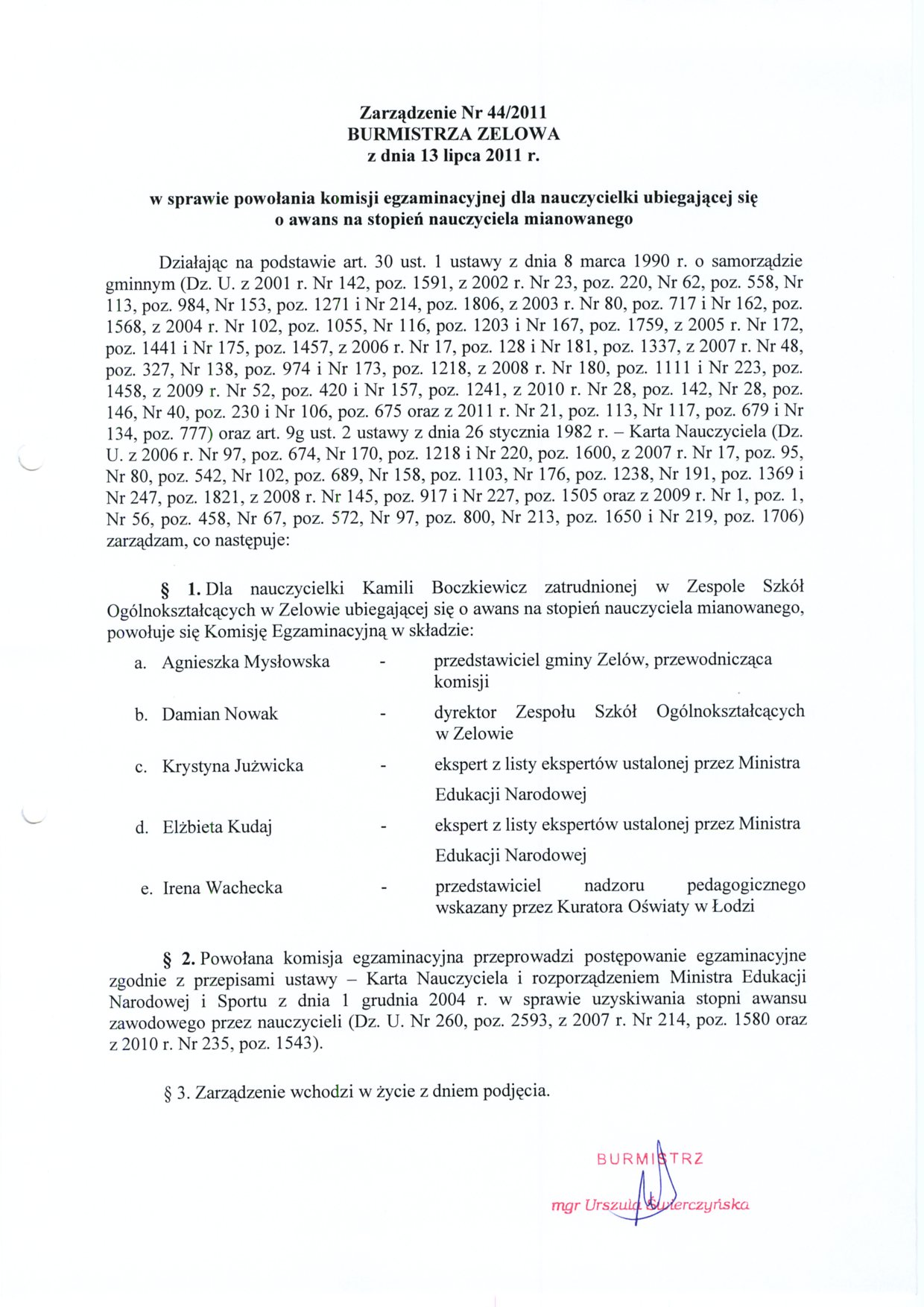 | Tytuł aktu prawnego - skrócony: | Zarządzenie w sprawie powołania komisji egzaminacyjnej dla nauczycielki ubiegającej się o awans na stopień nauczyciela mianowanego |