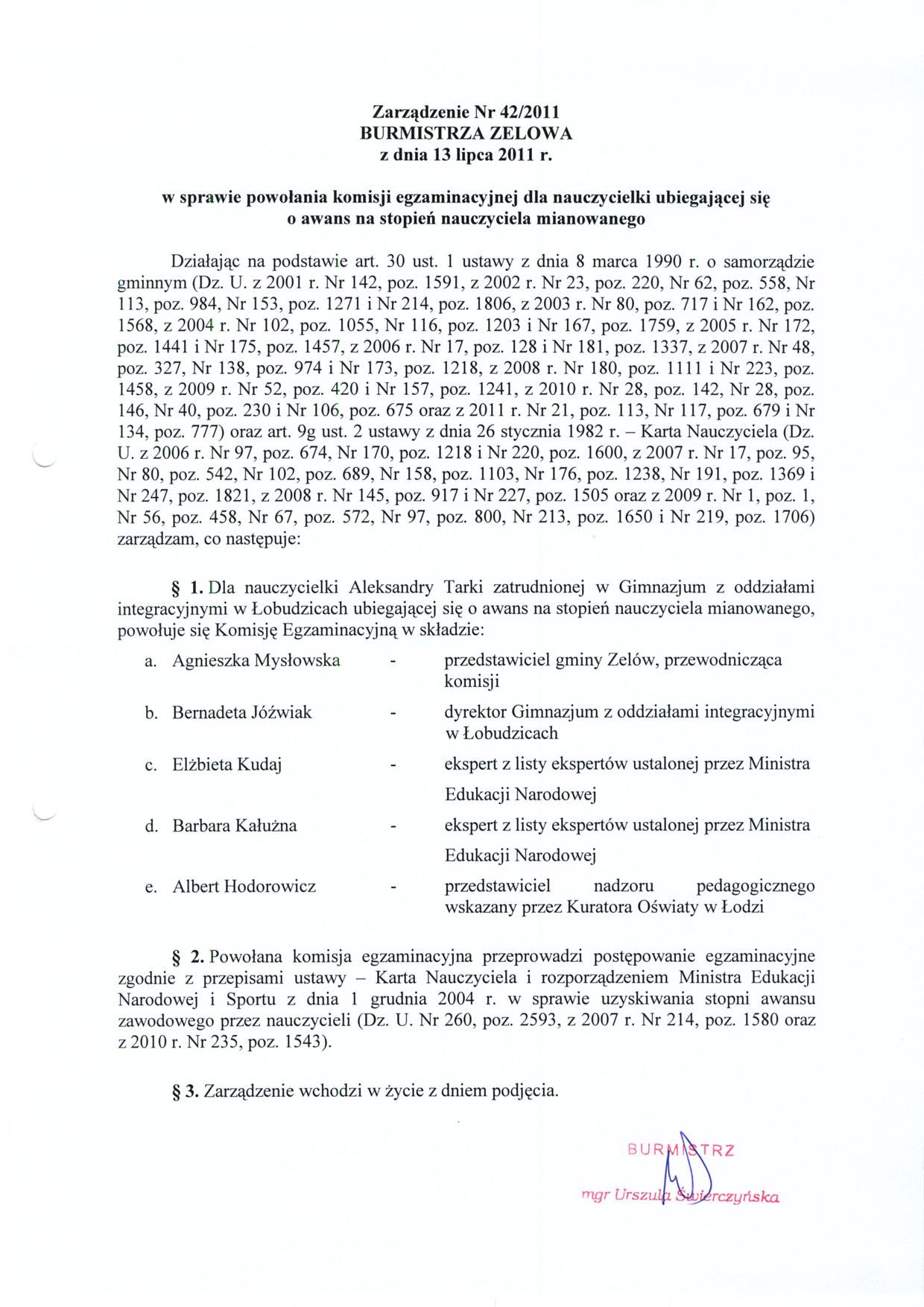 | Tytuł aktu prawnego - skrócony: | Zarządzenie w sprawie powołania komisji egzaminacyjnej dla nauczycielki ubiegającej się o awans na stopień nauczyciela mianowanego |