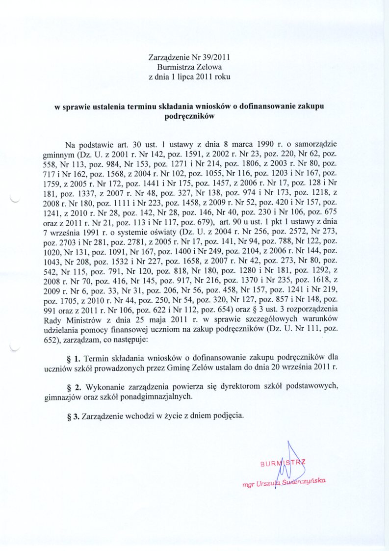 | Tytuł aktu prawnego - skrócony: | Zarządzenie w sprawie ustalenia terminu składania wniosków o dofinansowanie zakupu podręczników |