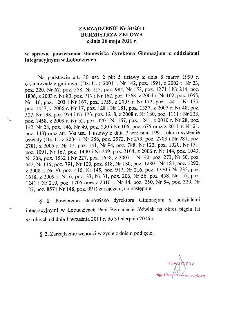 | Tytuł aktu prawnego - skrócony: | Zarządzenie w sprawie powierzenia stanowiska dyrektora Gimnazjum z oddziałmi integracyjnymi w Łobudzicach |