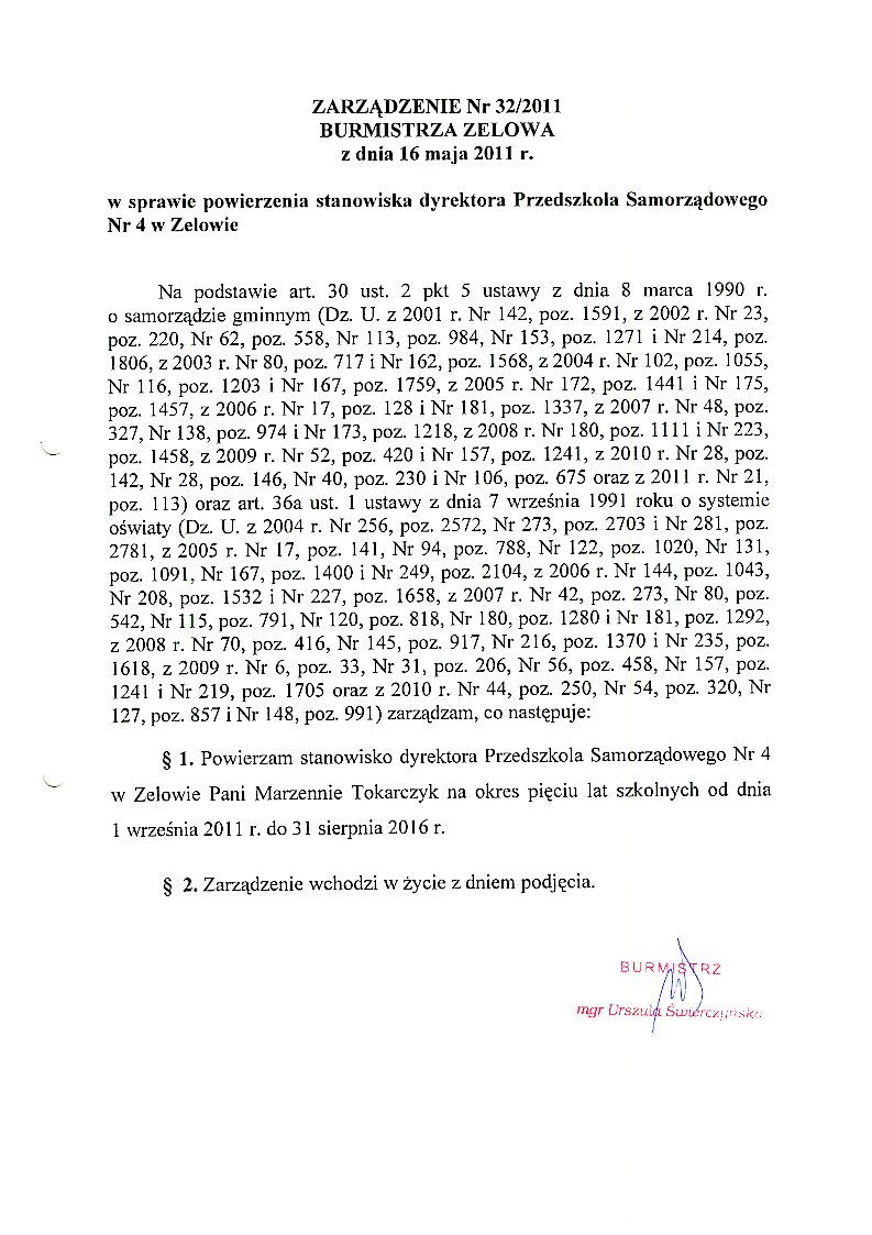 | Tytuł aktu prawnego - skrócony: | Zarządzenie w sprawie powierzenia stanowiska dyrektora Przedszkola Samorządowego Nr 4 w Zelowie |