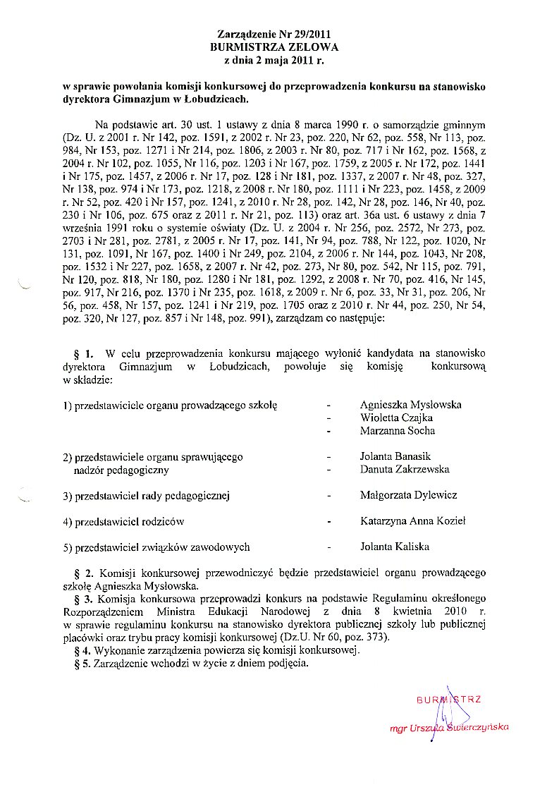 | Tytuł aktu prawnego - skrócony: | Zarządzenie w sprawie powołania komisji konkursowej do przeprowadzenia konkursu na stanowisko dyrektora Gimnazjum w Łobudzicach |