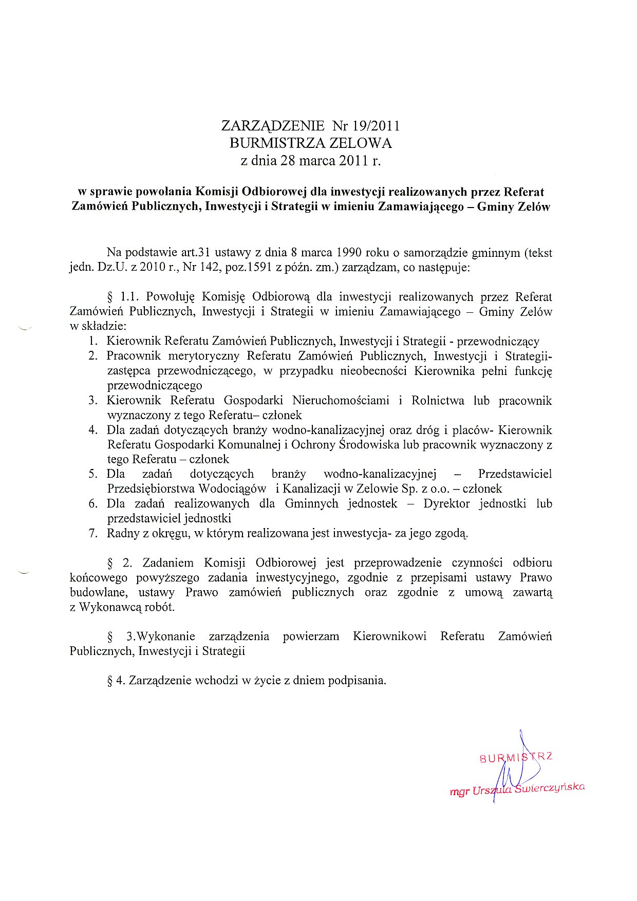 | Tytuł aktu prawnego - skrócony: | Zarządzenie w sprawie powołania Komisji Odbiorowej dla inwestycji realizowanych przez referat Zamówień Publicznych, Inwestycji i Strategii w imieniu Zamawiającego - Gminy Zelów |