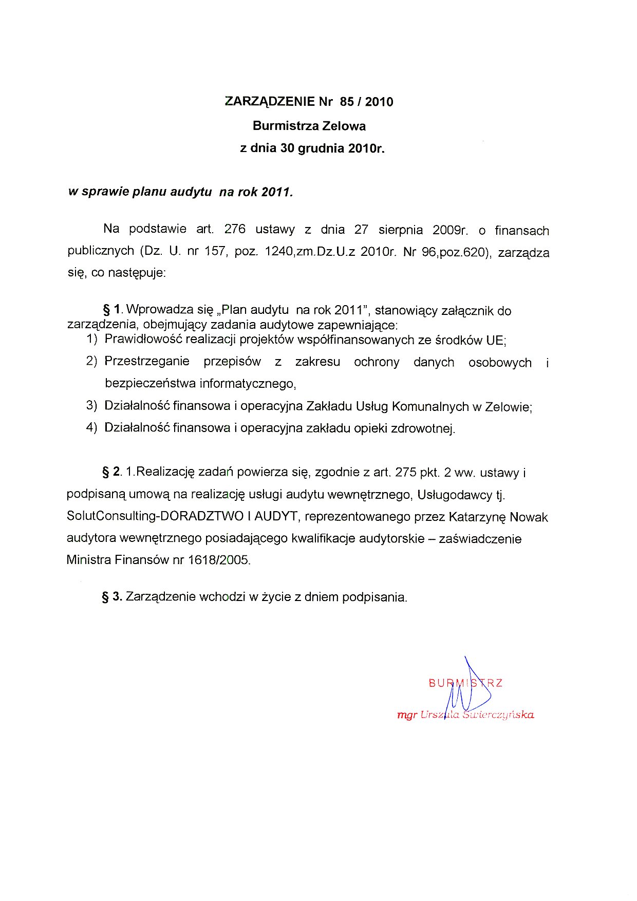 | Tytuł aktu prawnego - skrócony: | Zarządzenie w sprawie planu audytu na rok 2011 |