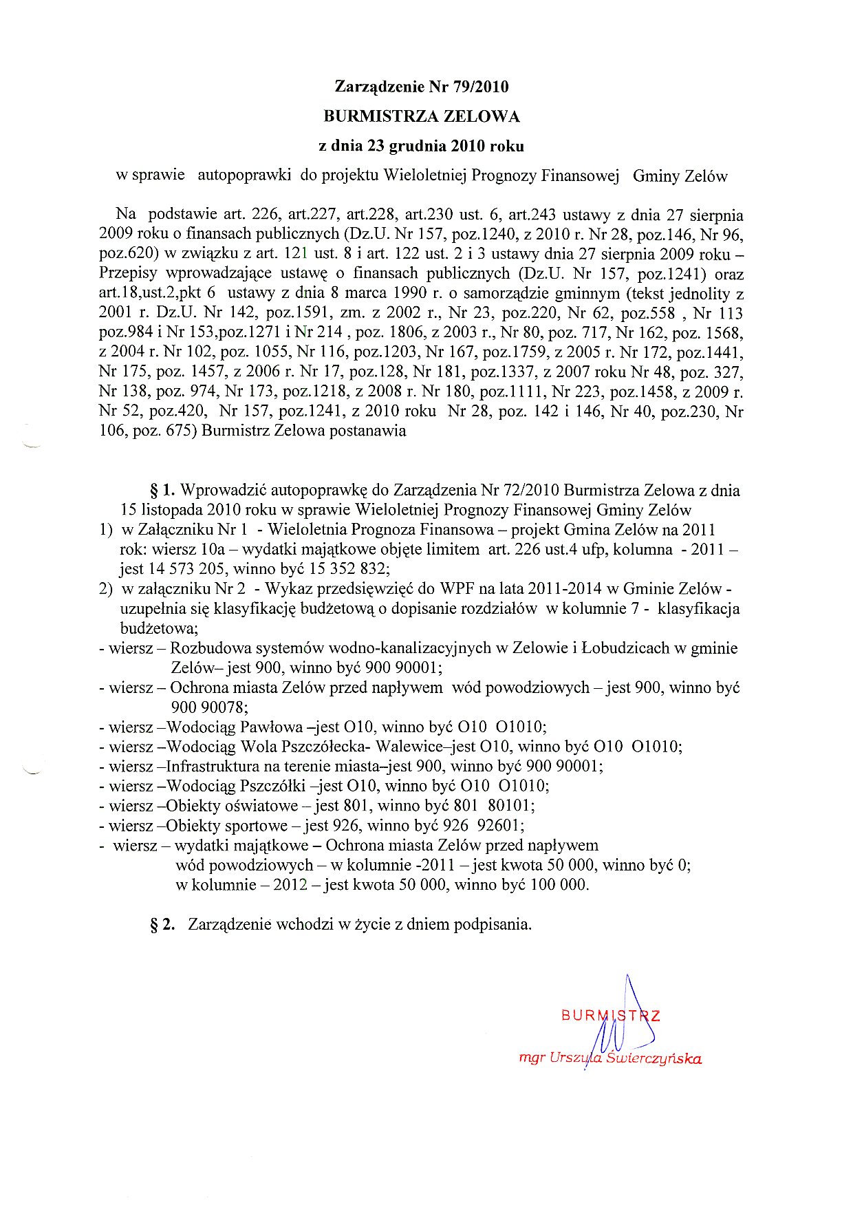 | Tytuł aktu prawnego - skrócony: | Zarządzenie w sprawie autopoprawki do projektu Wieloletniej Prognozy Finansowej Gminy Zelów |