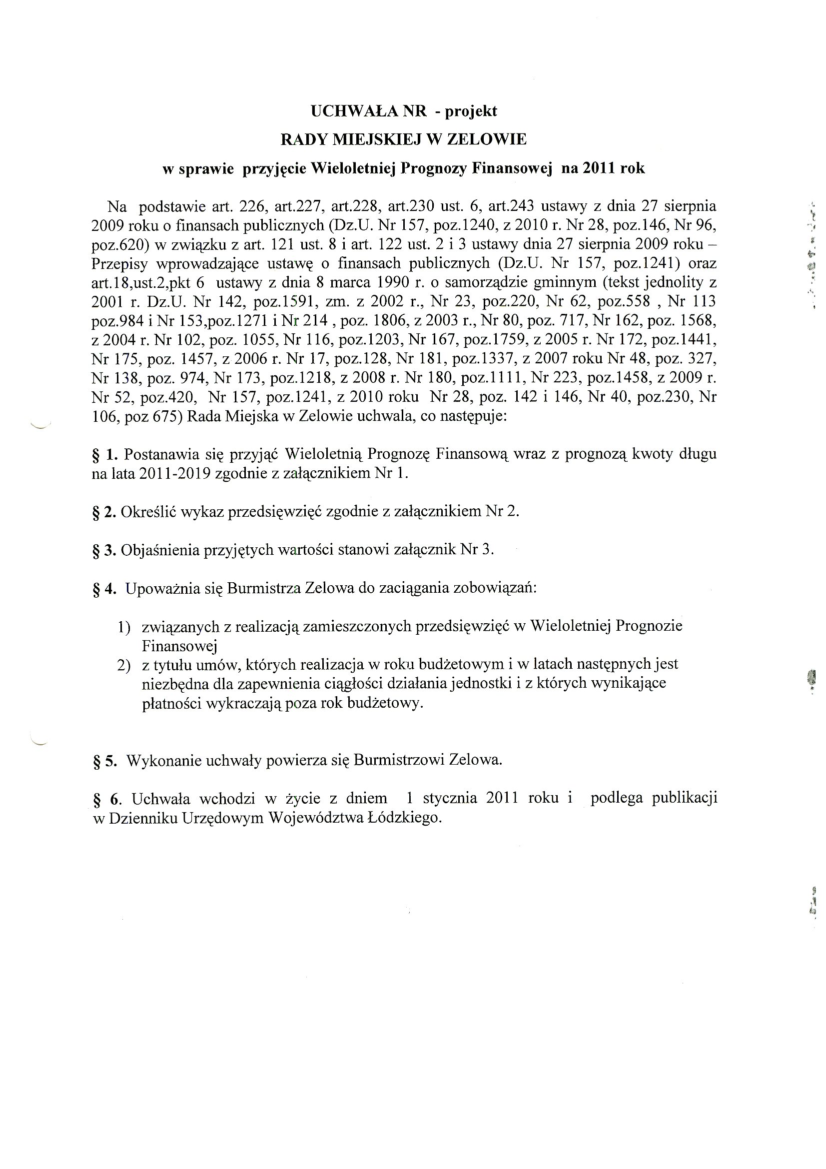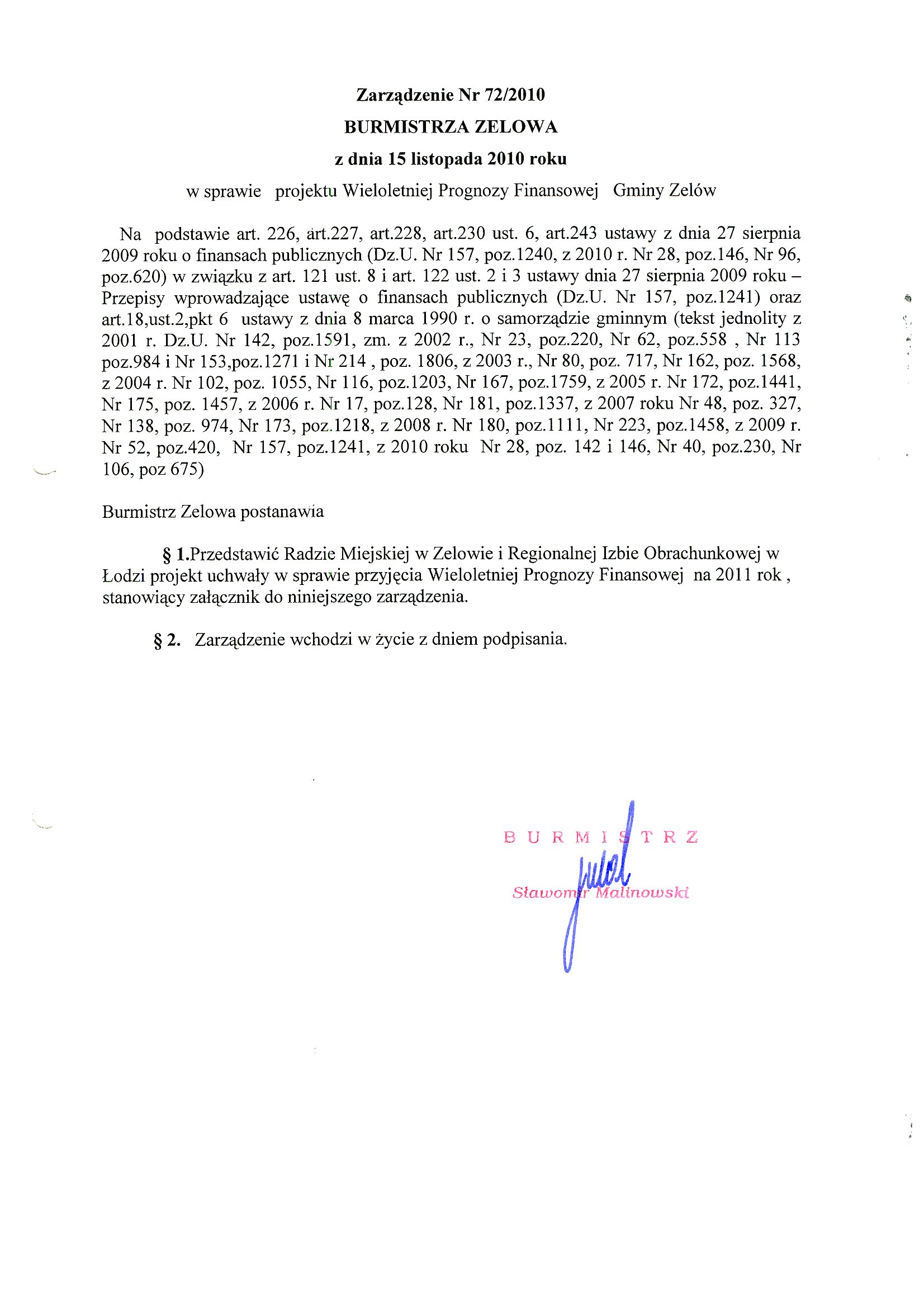 | Tytuł aktu prawnego - skrócony: | Zarządzenie w sprawie projektu Wieloletniej Prognozy Finansowej Gminy Zelów |