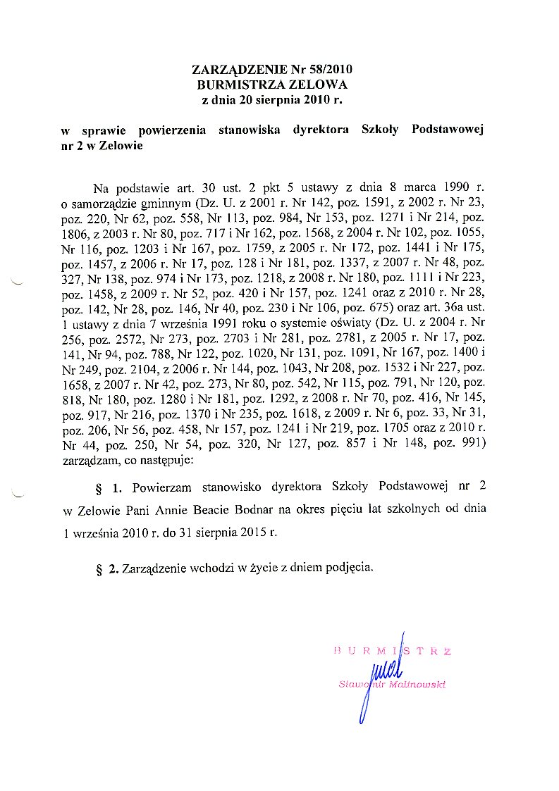 | Tytuł aktu prawnego - skrócony: | Zarządzenie w sprawie powierzenia stanowiska dyrektora Szkoły Podstawowej nr 2 w Zelowie |