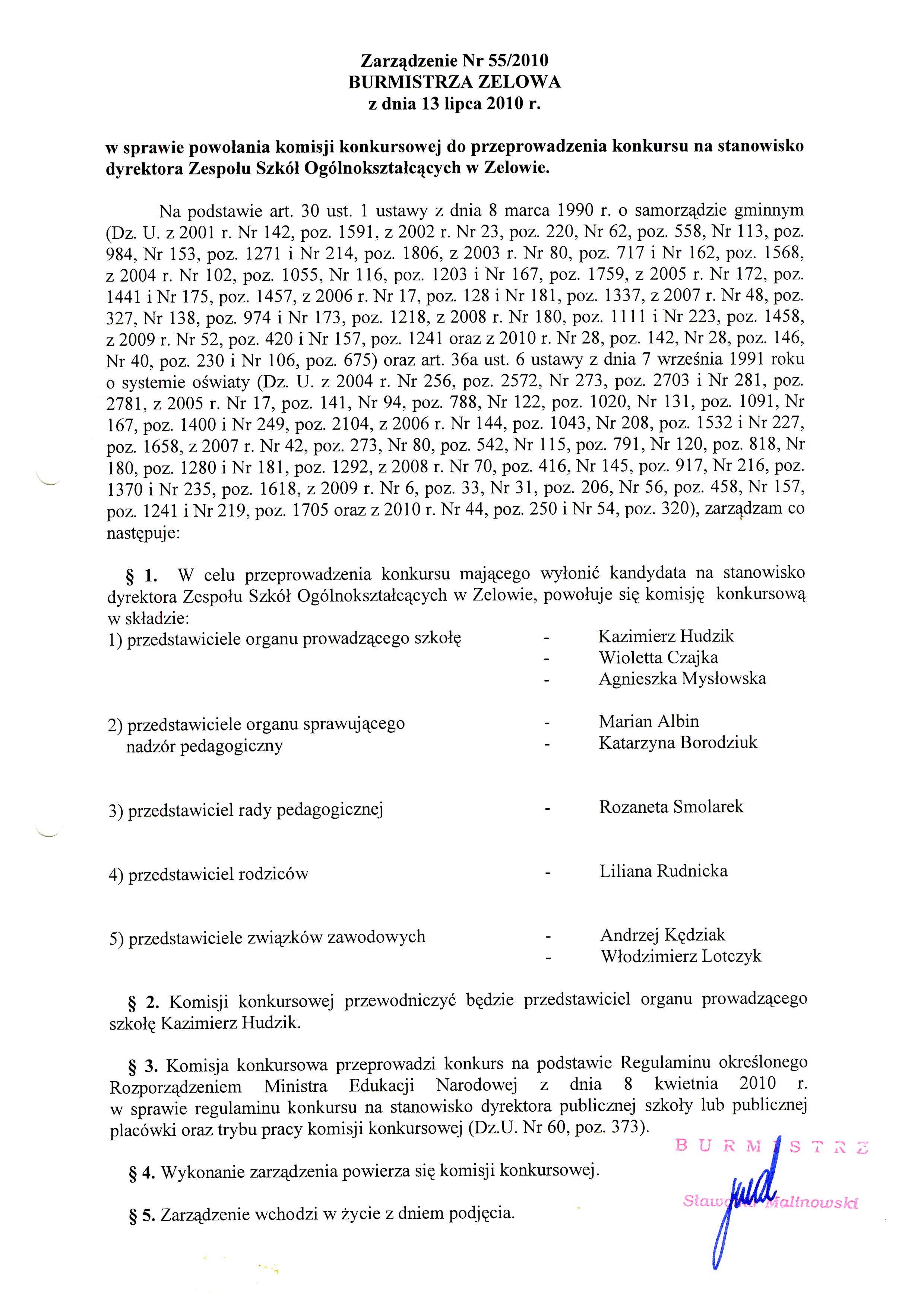 | Tytuł aktu prawnego - skrócony: | Zarządzenie w sprawie powołania komisji konkursowej do przeprowadzenia konkursu na stanowisko dyrektora Zespołu Szkół Ogólnokształcących w Zelowie |