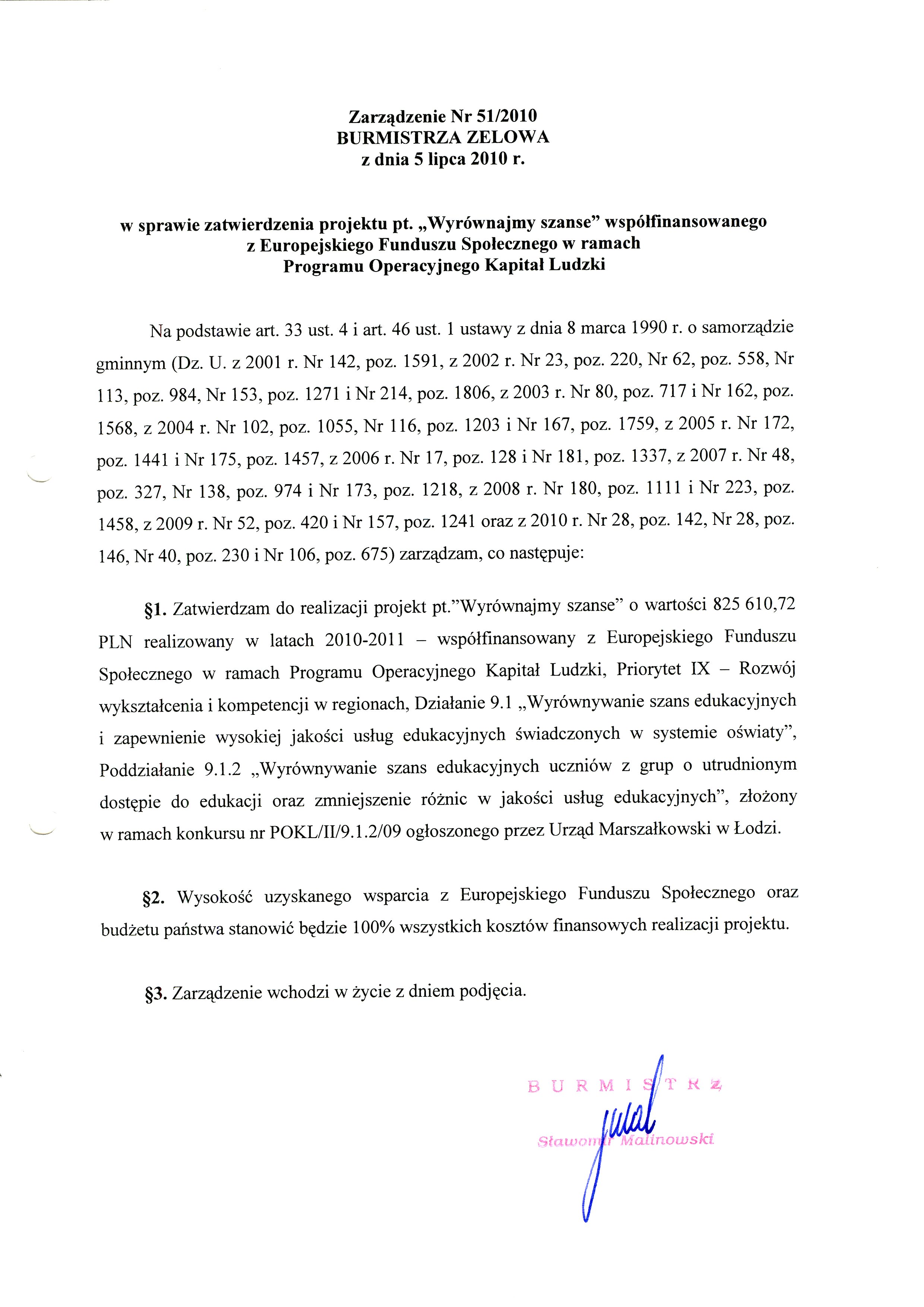 | Tytuł aktu prawnego - skrócony: | Zarządzenie w sprawie zatwierdzenia projektu pt. "Wyrównajmy szanse współfinansowanego z Europejskiego Funduszu Społecznego w ramach Programu Operacyjnego Kapitał Ludzki |