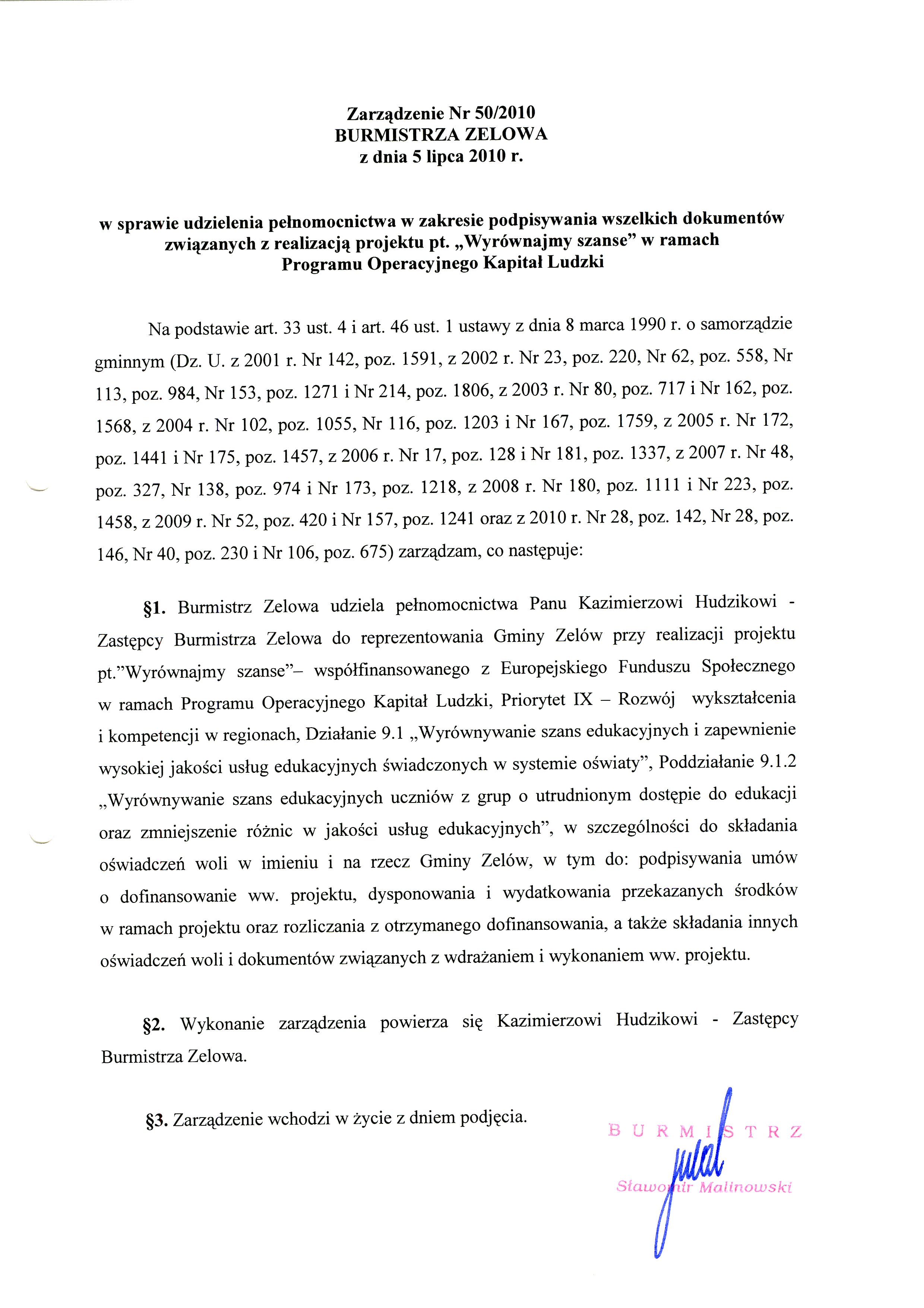 | Tytuł aktu prawnego - skrócony: | Zarządzenie w sprawie udzielenia pełnomocnictwa w zakresie podpisywania wszelkich dokumentów związanych z realizacją projektu pt. "Wyrównajmy szanse" w ramach Programu Operacyjnegio Kapitał Ludzki |
