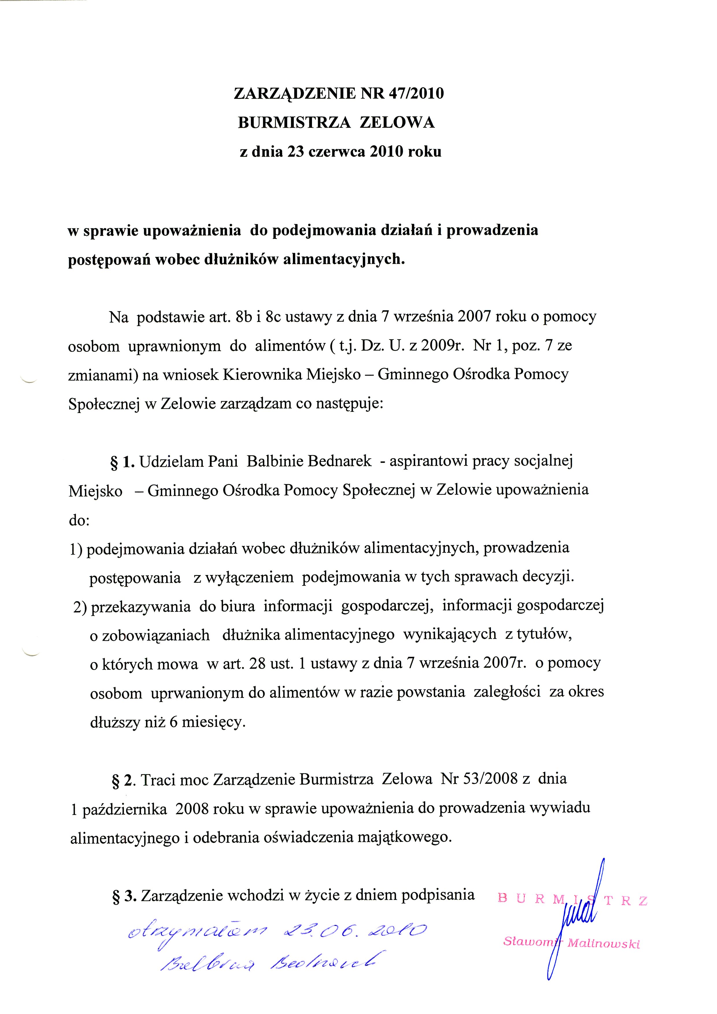 | Tytuł aktu prawnego - skrócony: | Zarządzenie w sprawie upoważnienia do podejmowania działań i prowadzenia postępowań wobec dłużników alimentacyjnych |