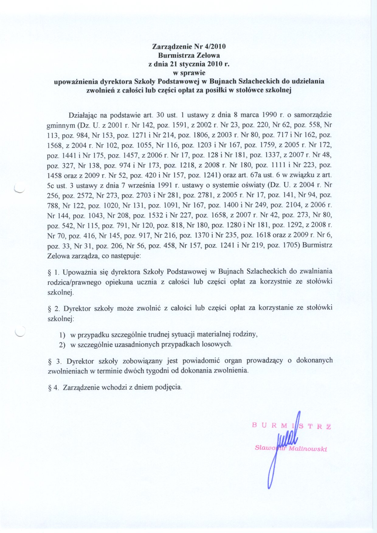 | Tytuł aktu prawnego - skrócony: | Zarządzenie w sprawie upowaznienia dyrektora Szkoły POdstawowej w Bujnach Szlacheckich do udzielenia zwolnień z całości lub części opłat za posiłki w stołówce szkolnej |