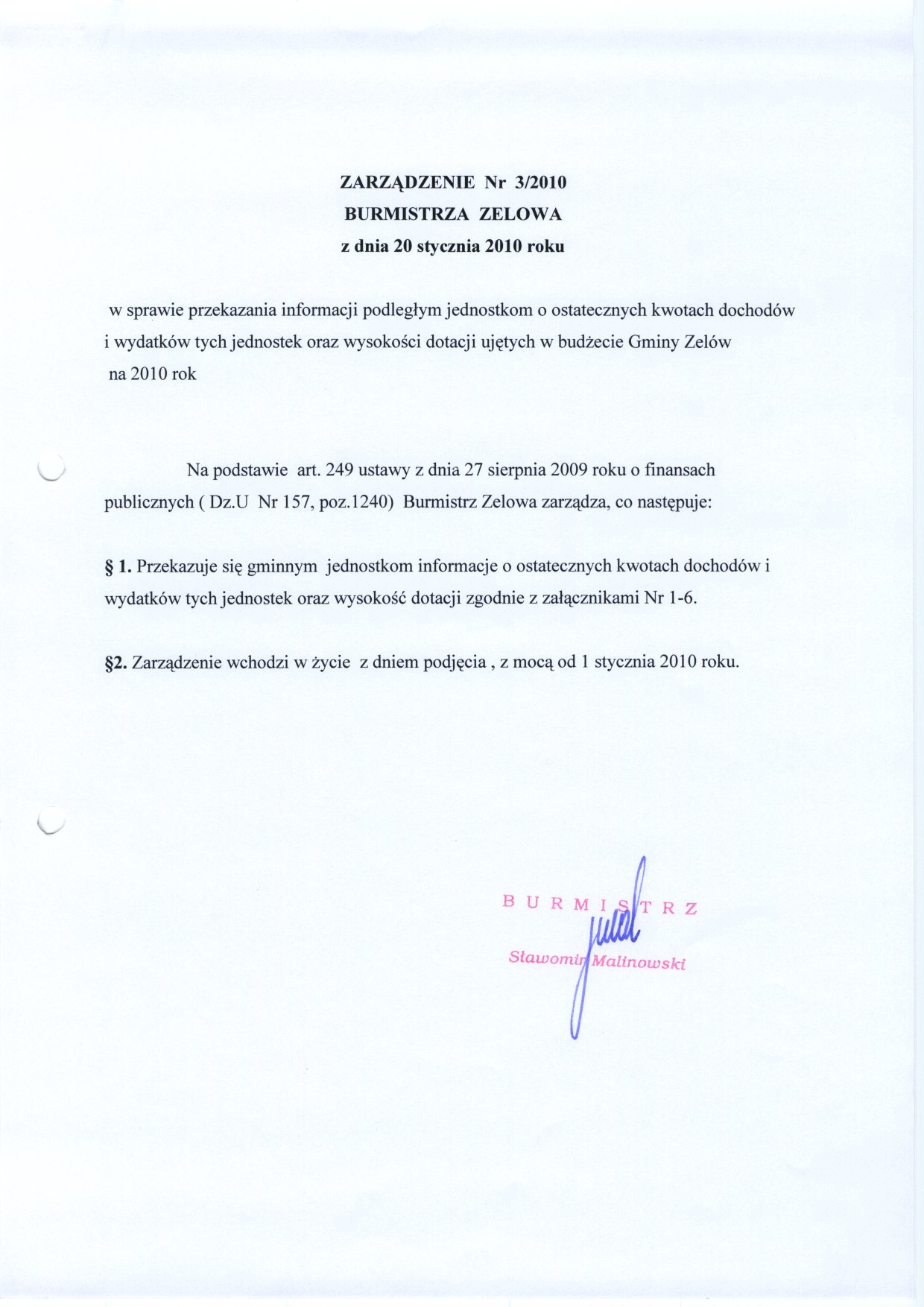 | Tytuł aktu prawnego - skrócony: | Zarządzenie w sprawie przekazania informacji podległym jednostkom o ostatecznych kwotach dochodów i wydatków tych jednostek oraz wysokości dotacji ujętych w budżecie Gminy Zelów na 2010 rok |