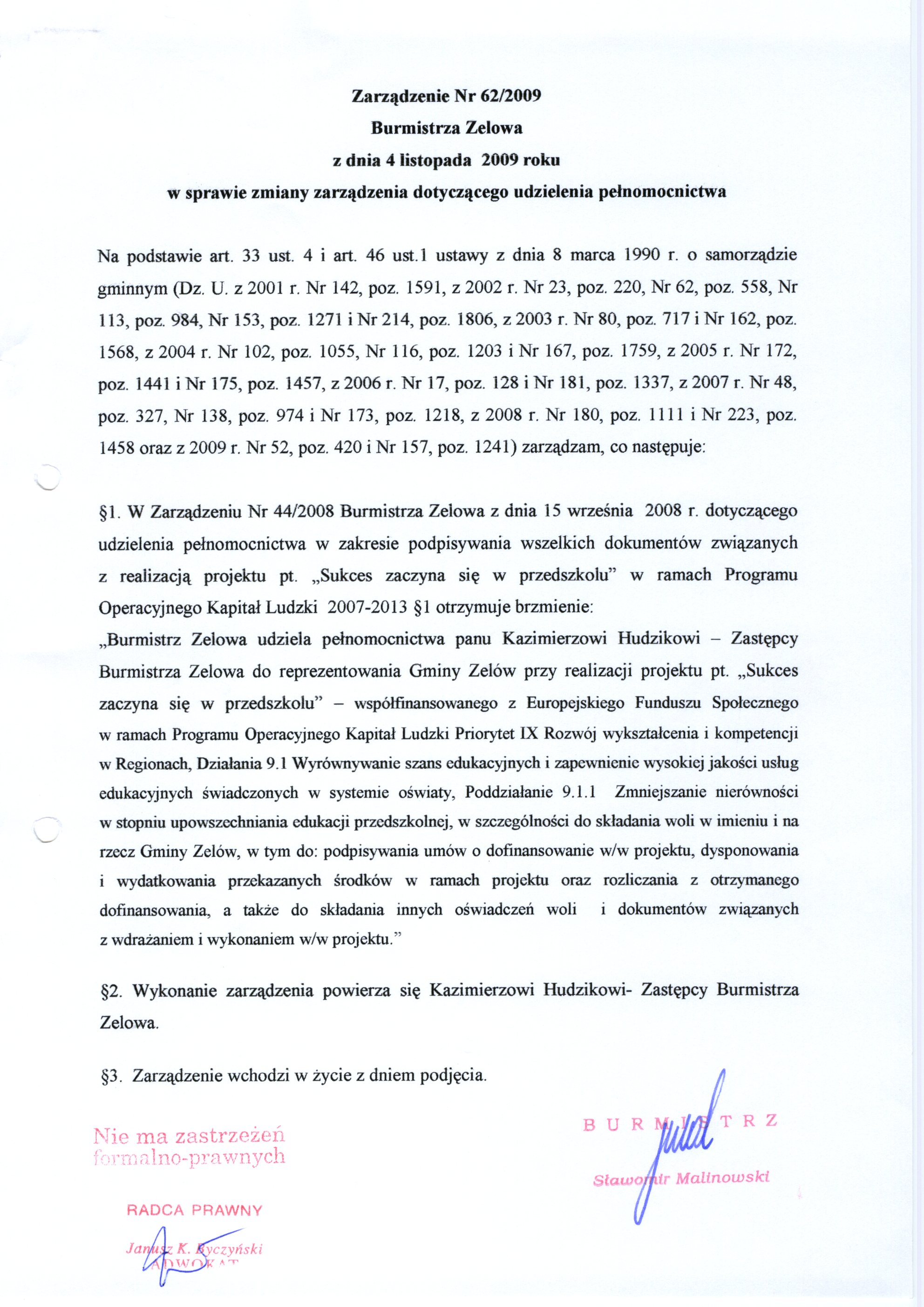 | Tytuł aktu prawnego - skrócony: | zmiany Zarządzenia dotyczącego udzielenia pełnomocnictwa |