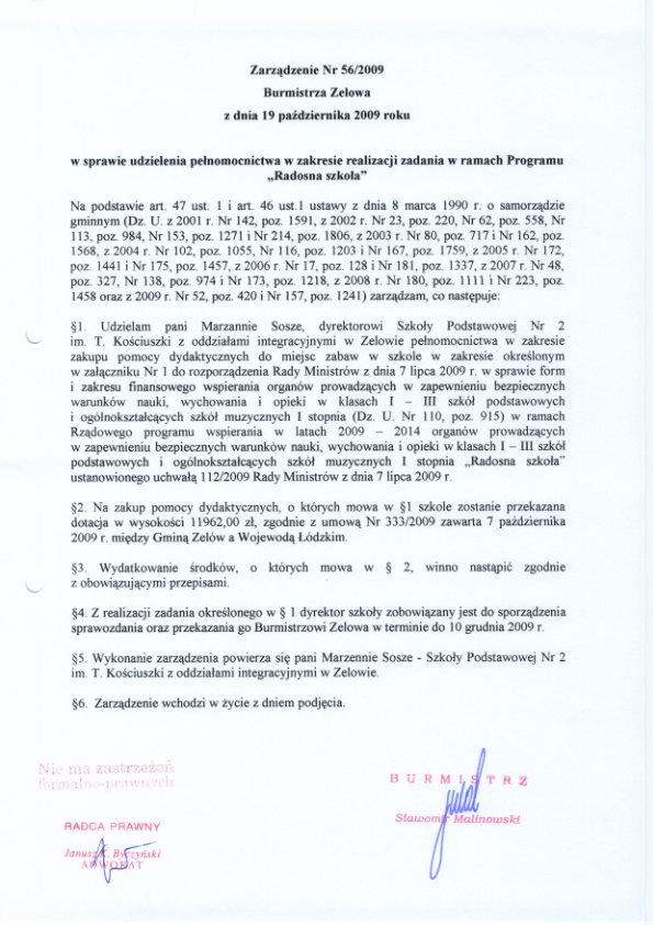 | Tytuł aktu prawnego - skrócony: | Zarządzenie w sprawie udzielenia pełnomocnictwa w zakresie realizacji zadania w ramach Programu "Radosna szkoła" |