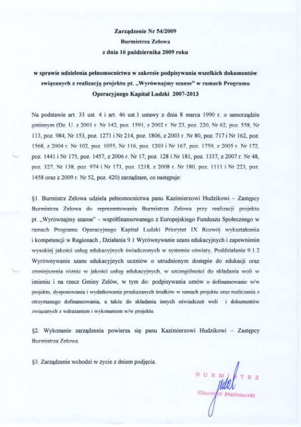 | Tytuł aktu prawnego - skrócony: | Zarządzenie w sprawie udzielenia pełnomocnictwa w zakresie podpisywania wszelkich dokumentów związanych z realizacją projektu pt. "Wyrównywanie szans" w ramach Programu Operacyjnego Kapitał Ludzki 2007-2013 |