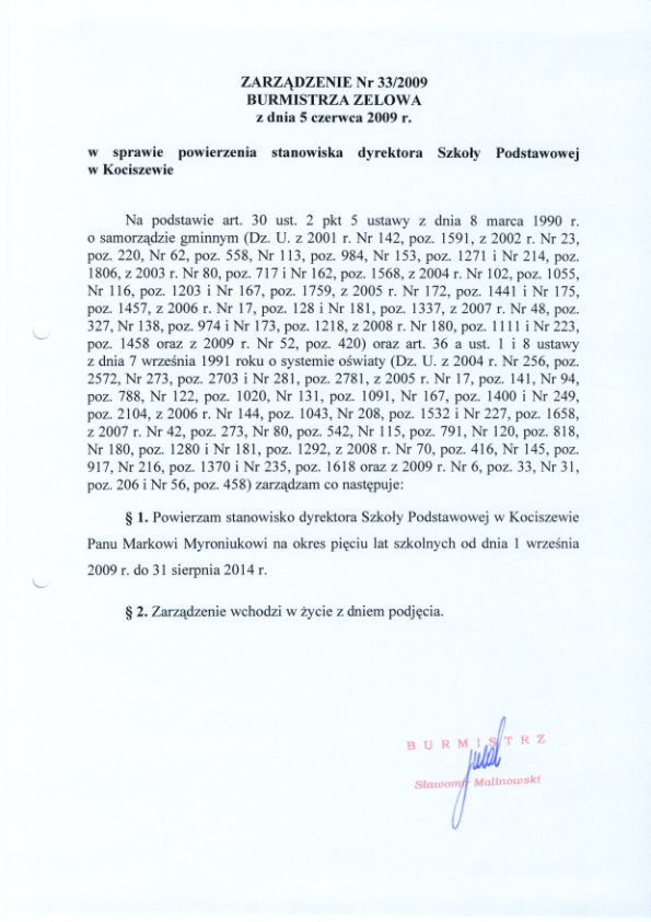 | Tytuł aktu prawnego - skrócony: | Zarządzenie w sprawie powierzenia stanowiska dyrektora Szkoły Podstawowej w Kociszewie |