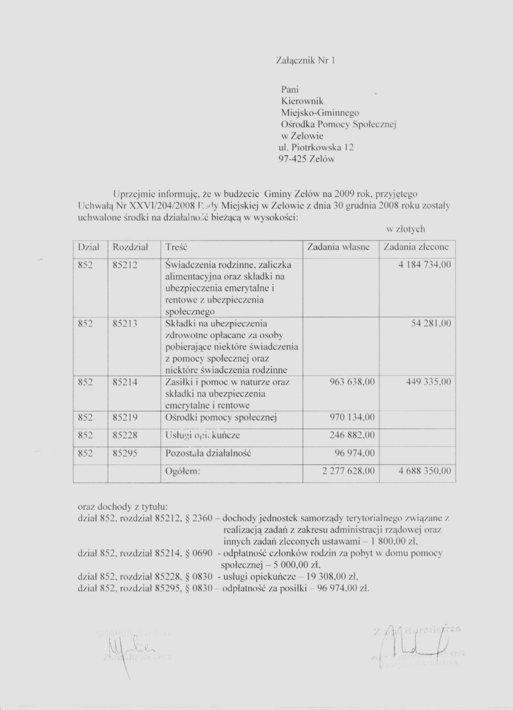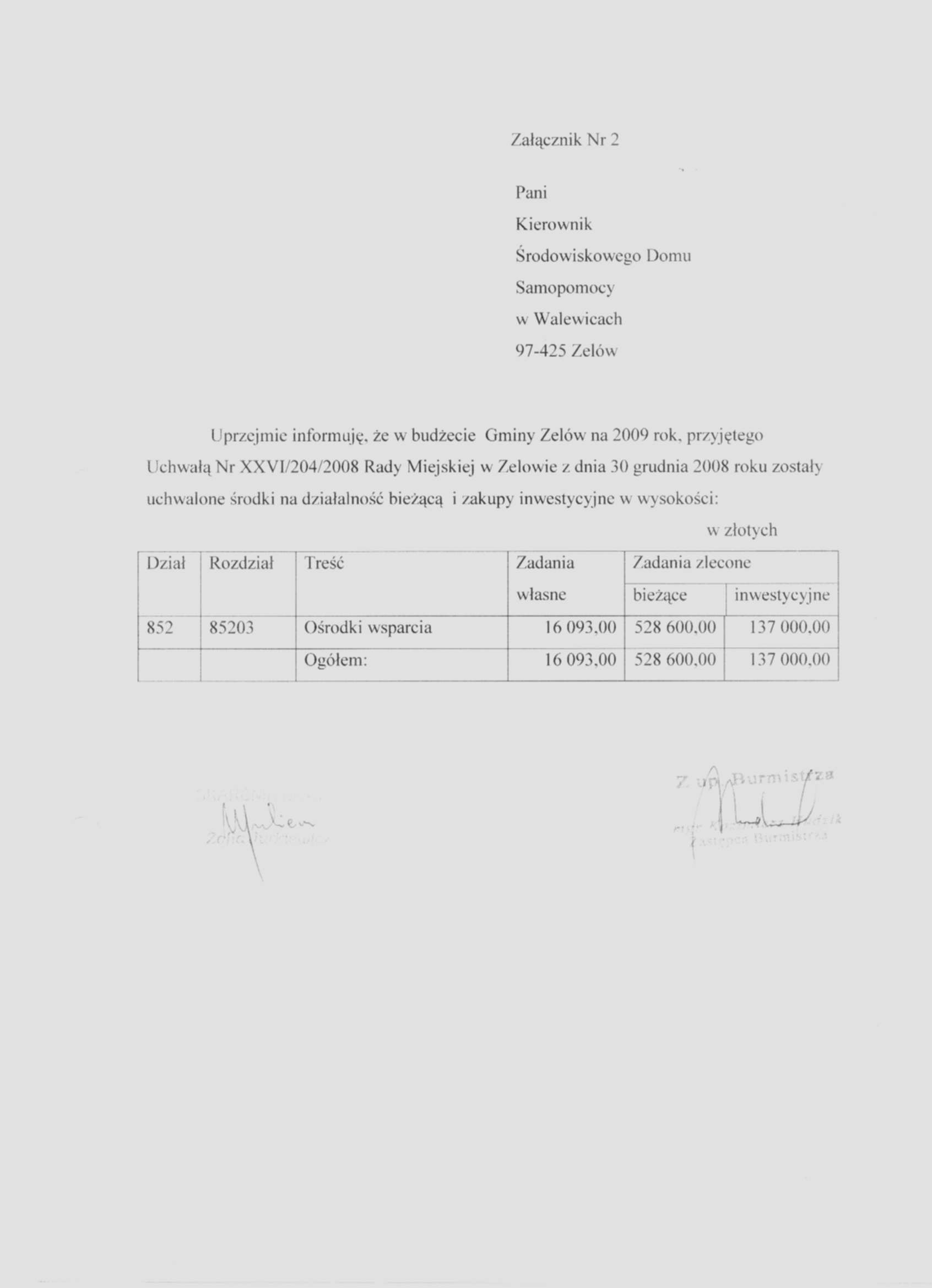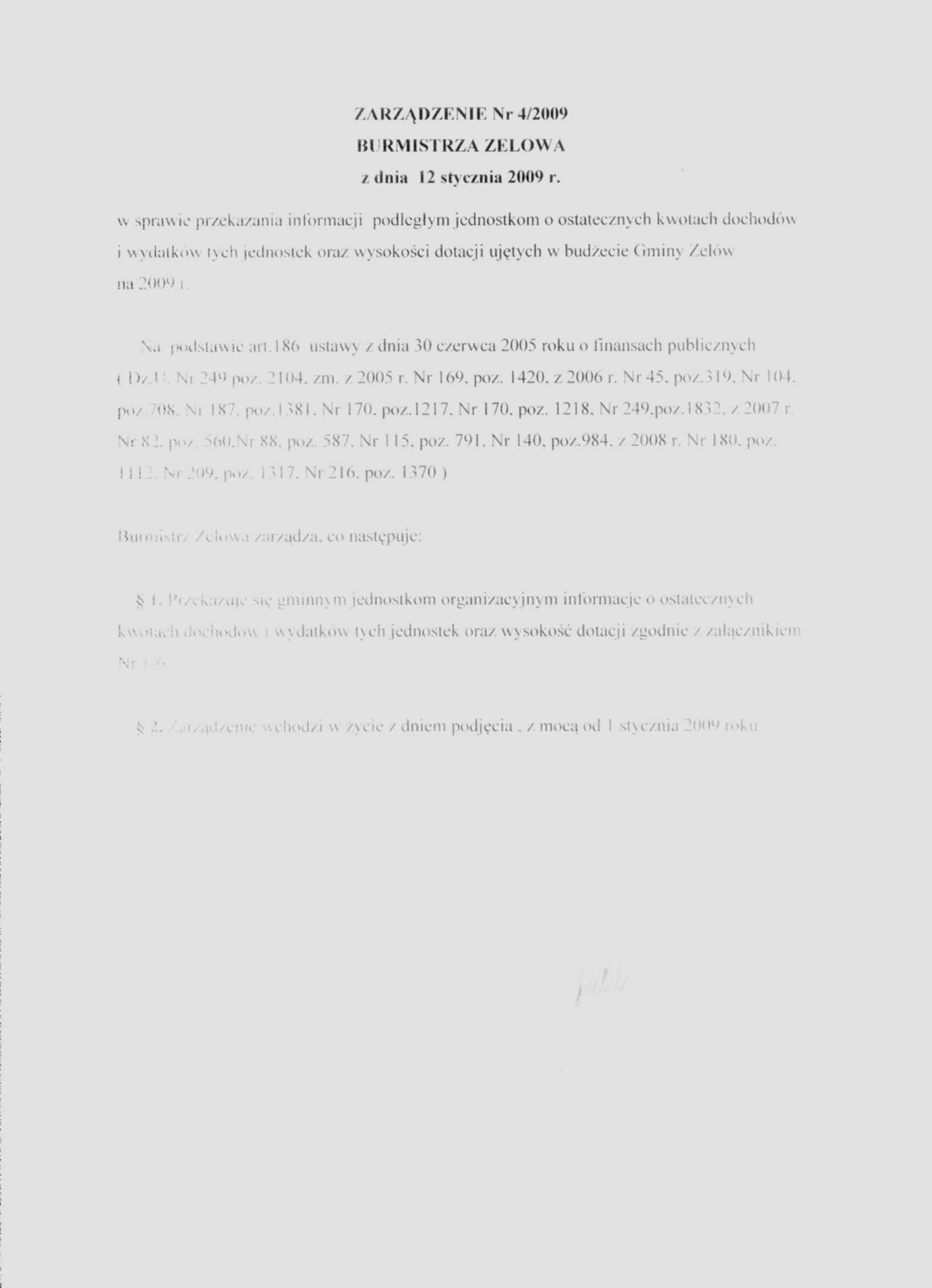 | Tytuł aktu prawnego - skrócony: | Zarządzenie w sprawie przekazania informacji podległym jednostkom o ostatecznych kwotach dochodów i wydatków tych jednostek oraz wysokości dotacji ujętych w budżecie Gminy Zelów na 2009 r. |
