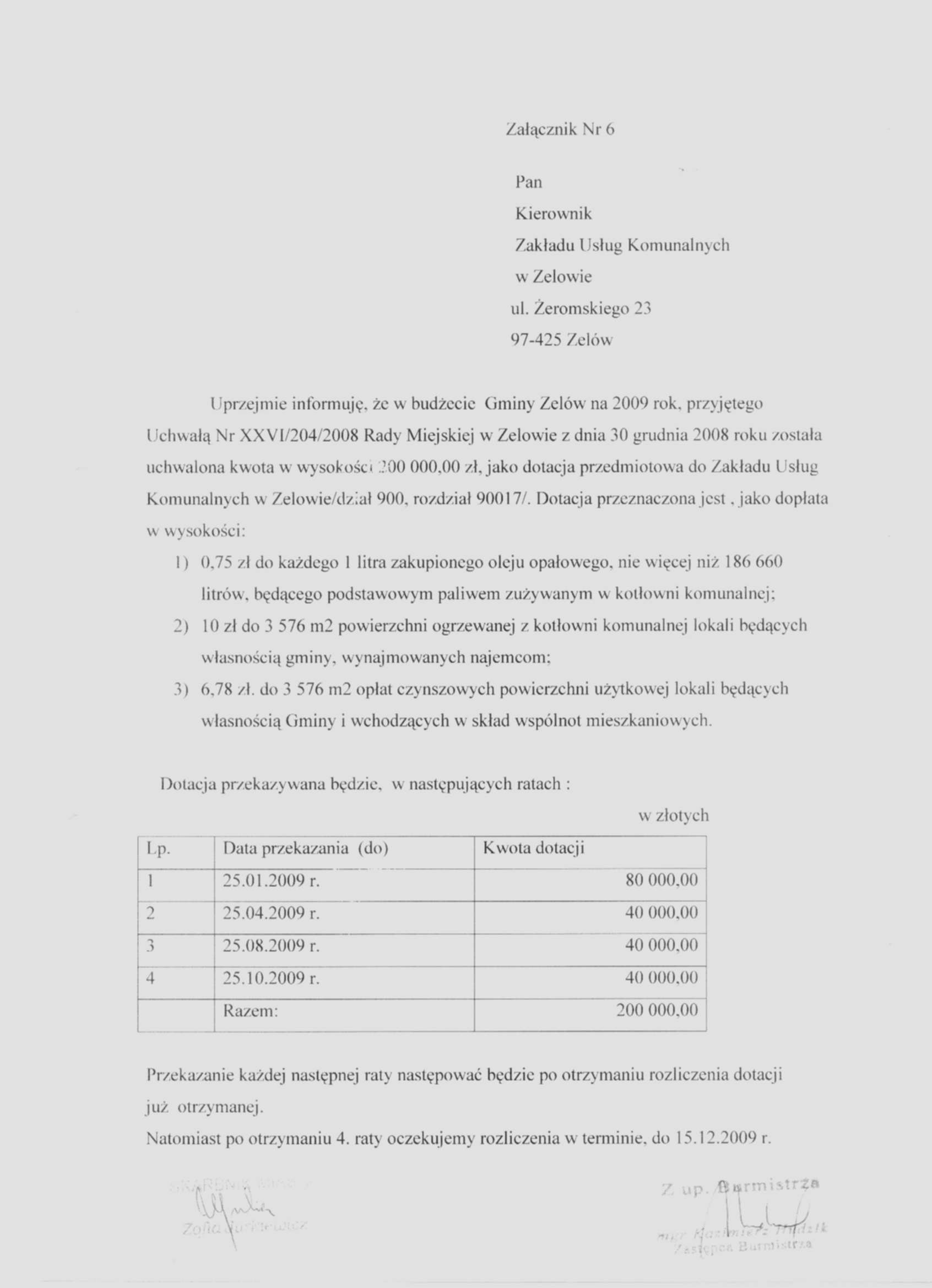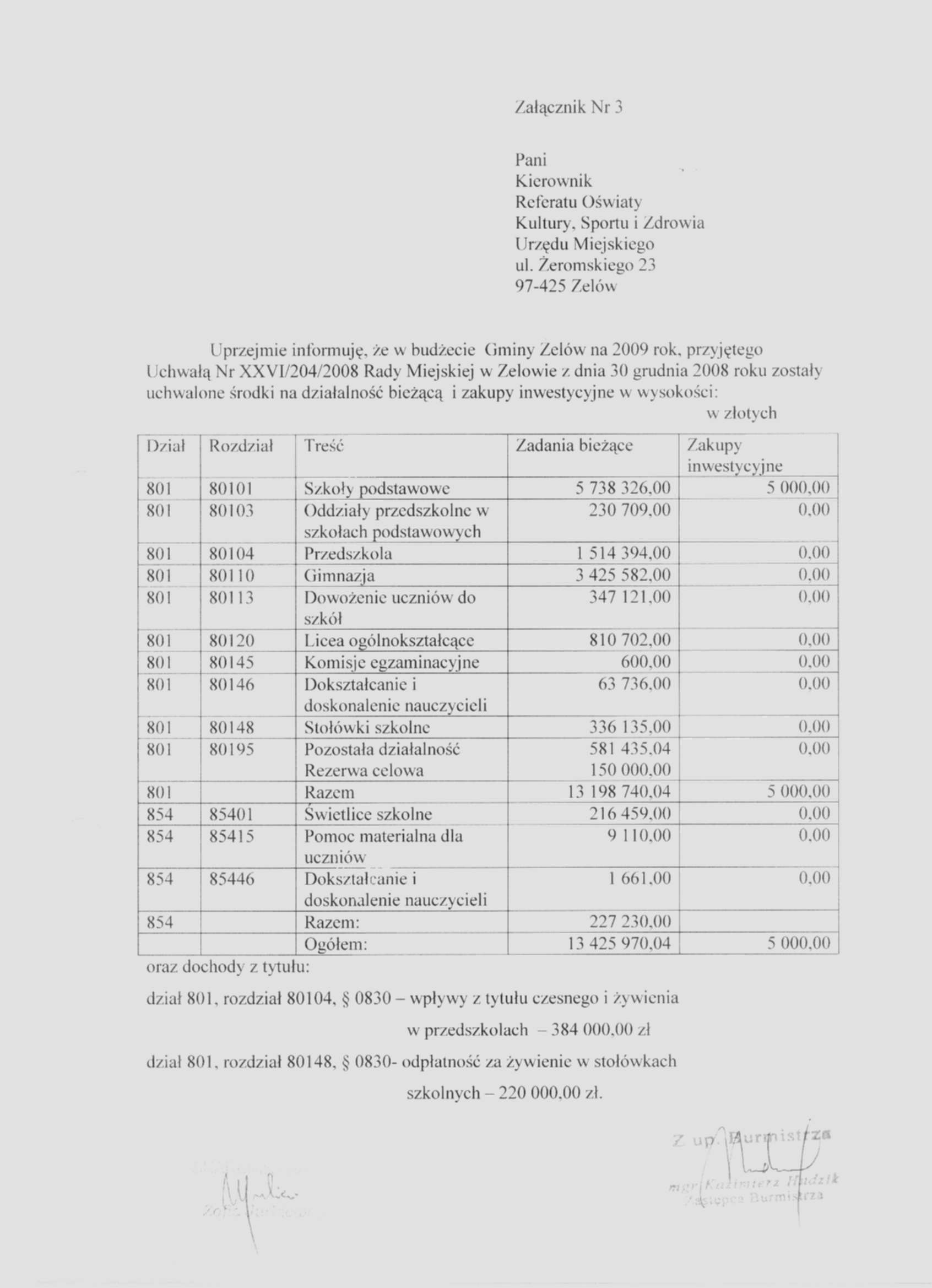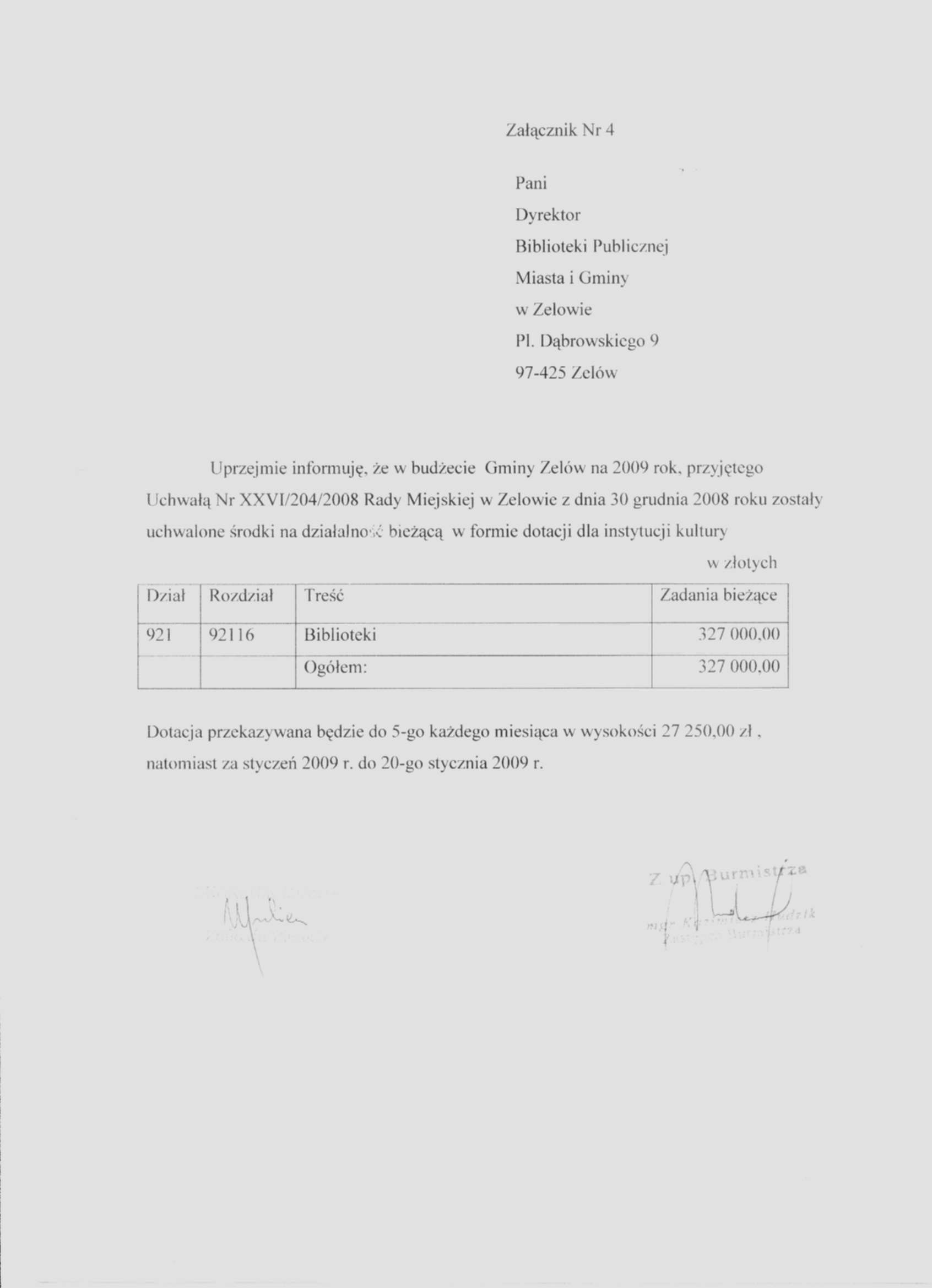 | Tytuł aktu prawnego - skrócony: | Zarządzenie w sprawie przekazania informacji podległym jednostkom o ostatecznych kwotach dochodów i wydatków tych jednostek oraz wysokości dotacji ujętych w budżecie Gminy Zelów na 2009 r. |