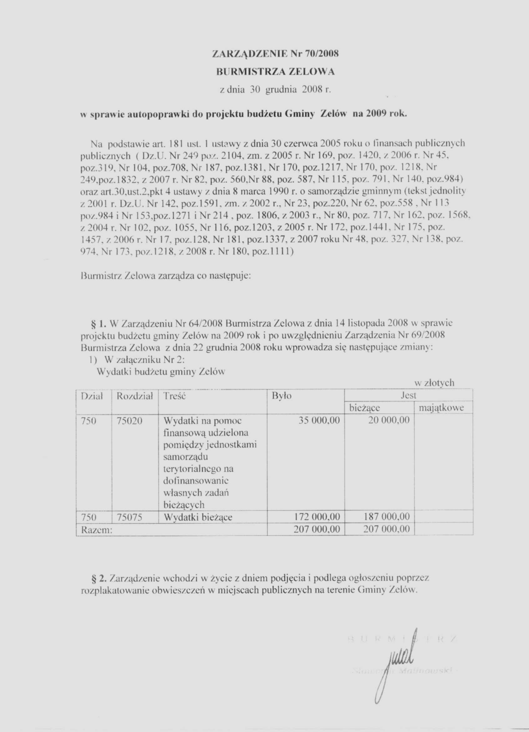 | Tytuł aktu prawnego - skrócony: | Zarządzenie w sprawie autopoprawki do projektu budżetu Gminy Zelów na 2009 rok |