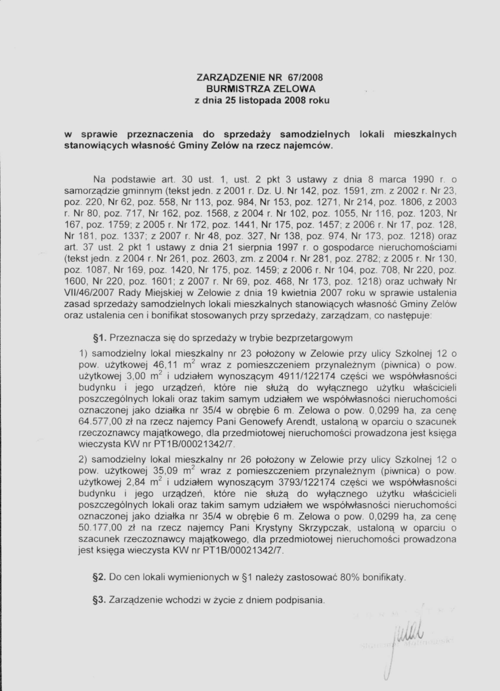 | Tytuł aktu prawnego - skrócony: | Zarządzenie w sprawie przeznaczenia do sprzedaży samodzielnych lokali mieszkalnych stanowiących własność Gminy Zelów na rzecz najemców |