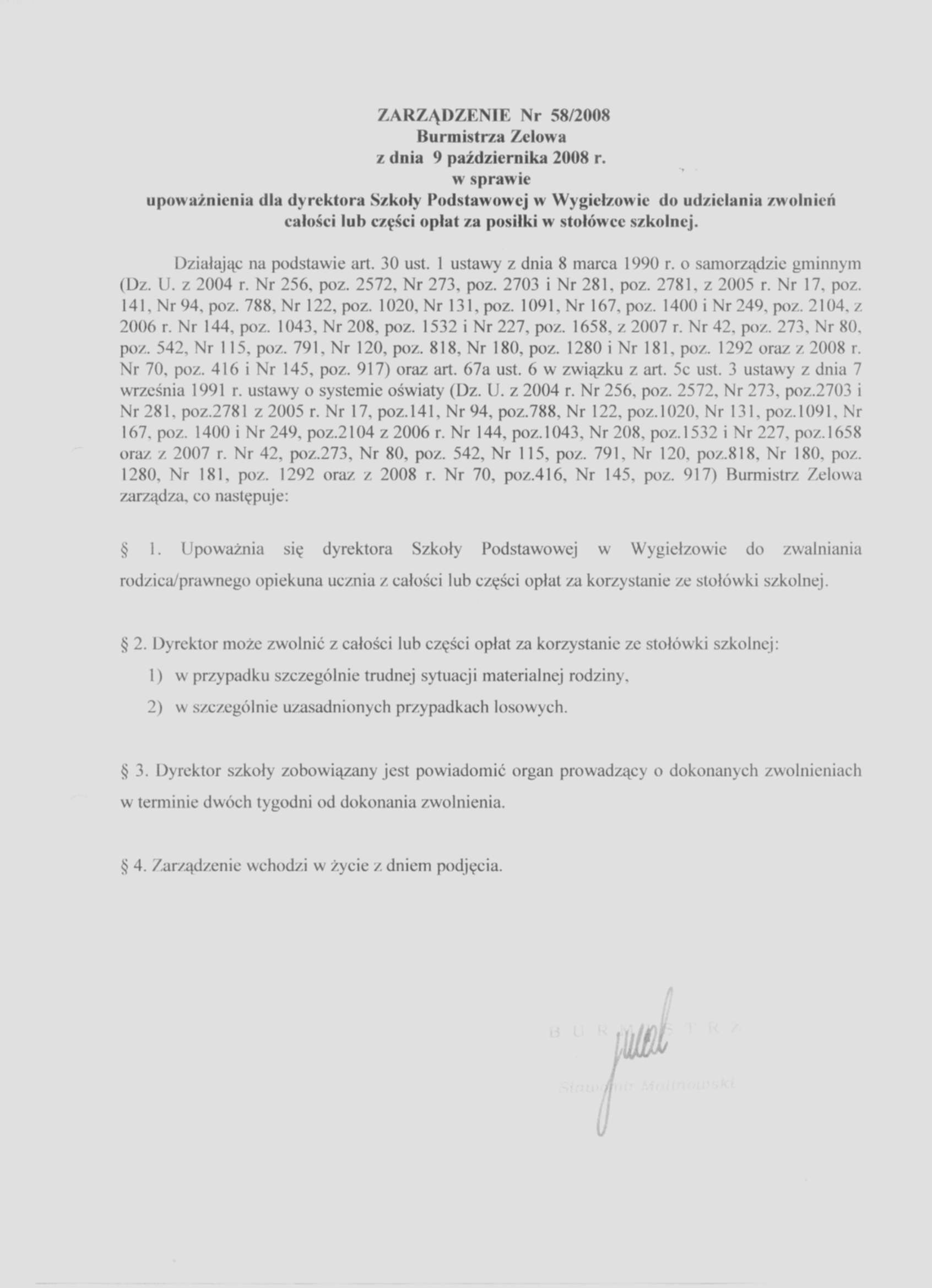 | Tytuł aktu prawnego - skrócony: | Zarządzenie w sprawie upoważnienia dla dyrektora Szkoły Podstawowej w Wygiełzowie do udzielania zwolnień całości lub części opłat za posiłki w stołówce szkolnej |