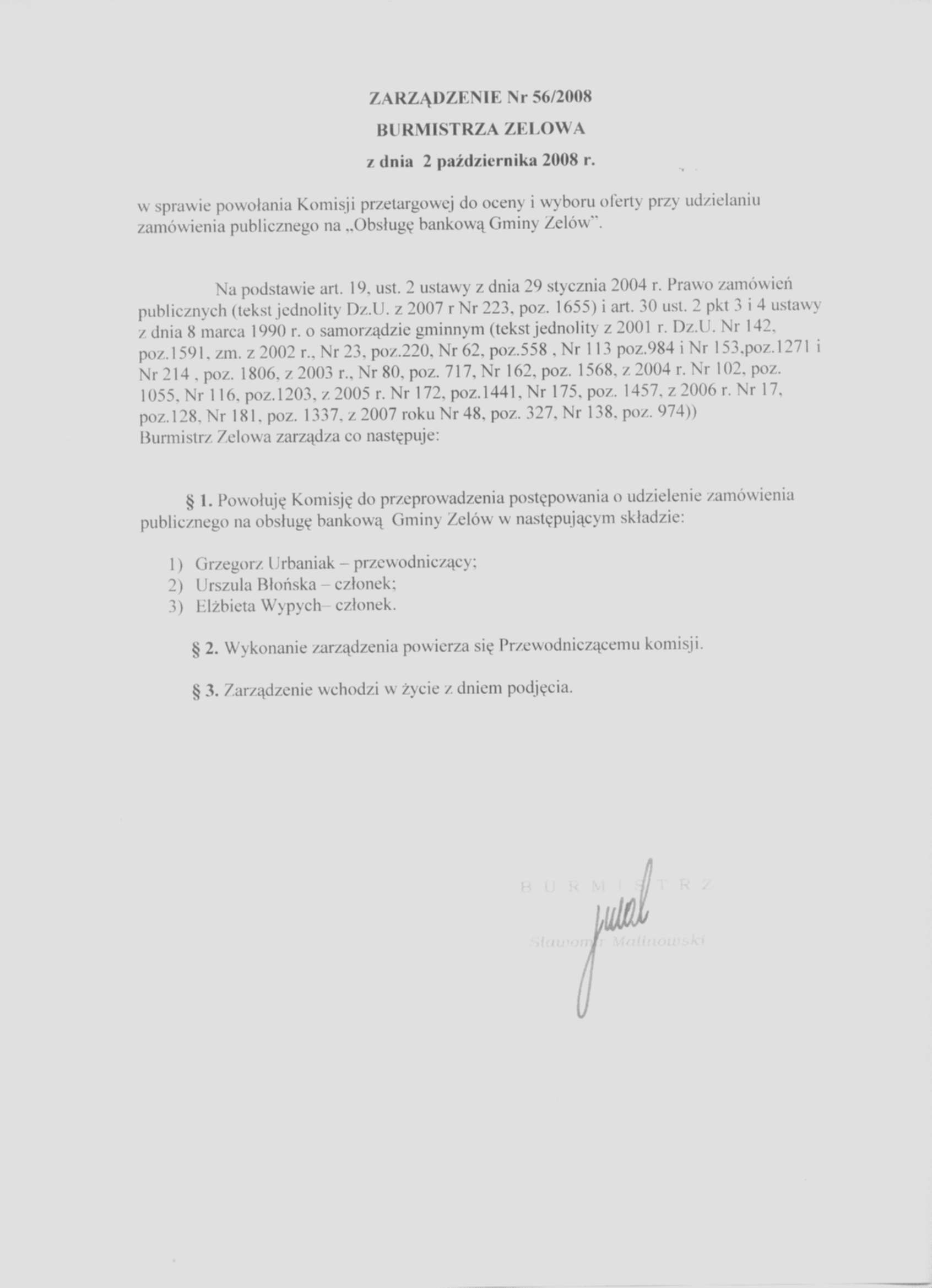 | Tytuł aktu prawnego - skrócony: | Zarządzenie w sprawie powołania Komisji przetargowej do oceny i wyboru oferty przy udzielaniu zamówienia publicznego na "Obsługę bankową Gminy Zelów" |