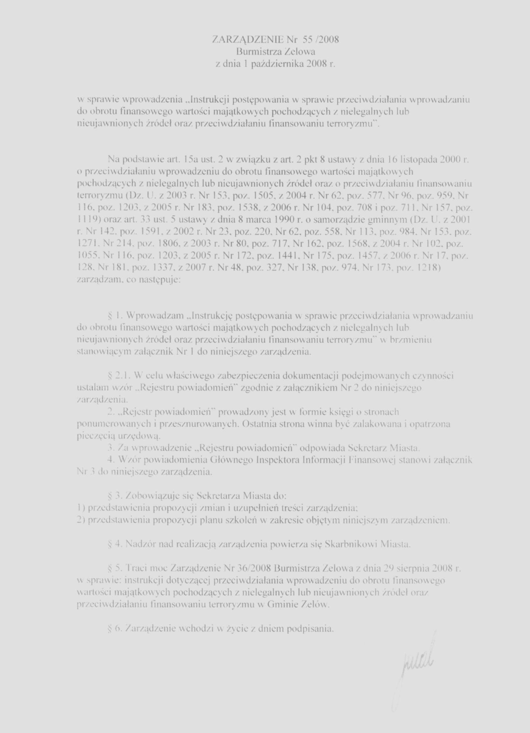 | Tytuł aktu prawnego - skrócony: | Zarządzenie w sprawie wprowadzenia "Instrukcji postępowania w sprawie przeciwdziałania wprowadzaniu do obrotu finansowego wartości majątkowych pochodzących z nielegalnych lub nieujawnionych źródeł oraz przeciwdziałaniu finansowaniu terroryzmu" |