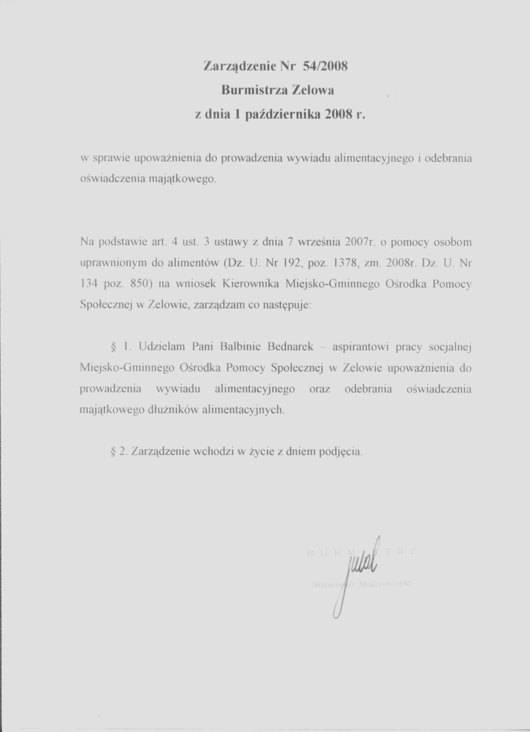 | Tytuł aktu prawnego - skrócony: | Zarządzenie w sprawie upoważnienia do prowadzenia wywiadu alimentacyjnego i odebrania świadczenia majątkowego |