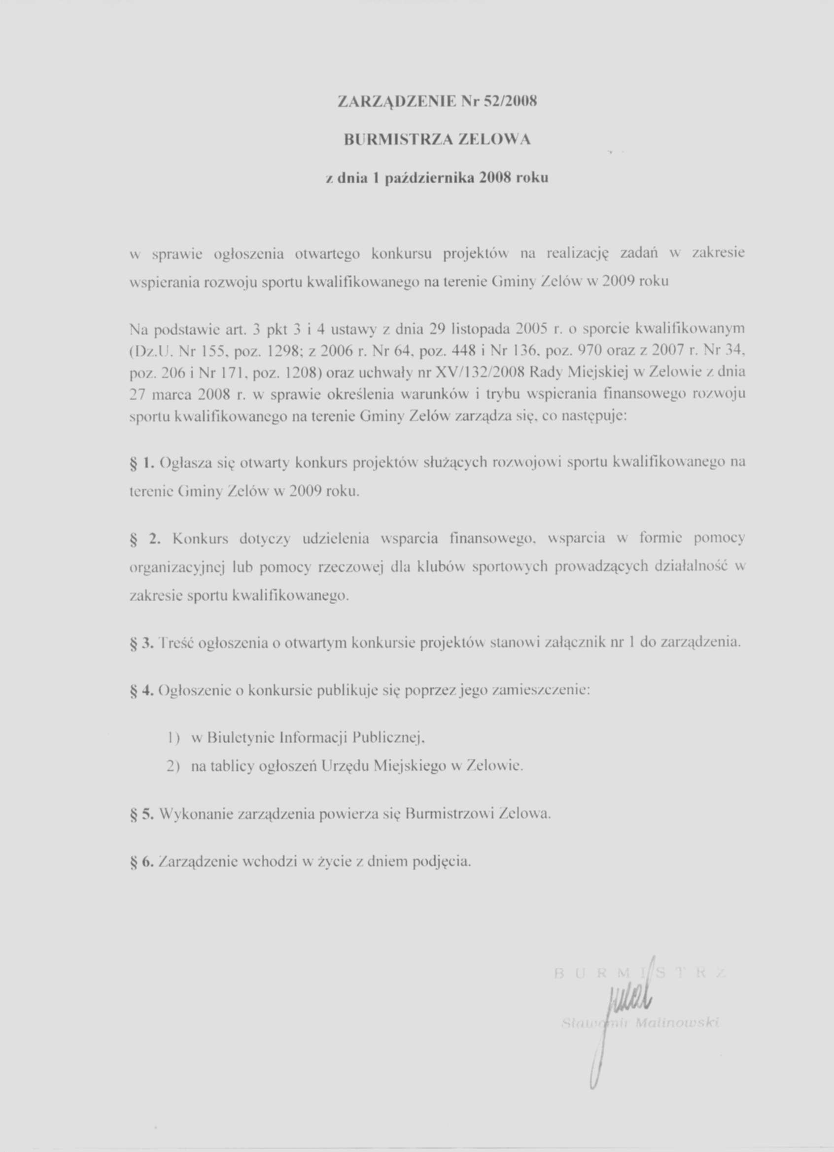 | Tytuł aktu prawnego - skrócony: | Zarządzenie w sprawie ogłoszenia otwartego konkursu projektów na realizację zadań w zakresie wspierania rozwoju sportu kwalifikowanego na terenie Gminy Zelów w 2009 roku |