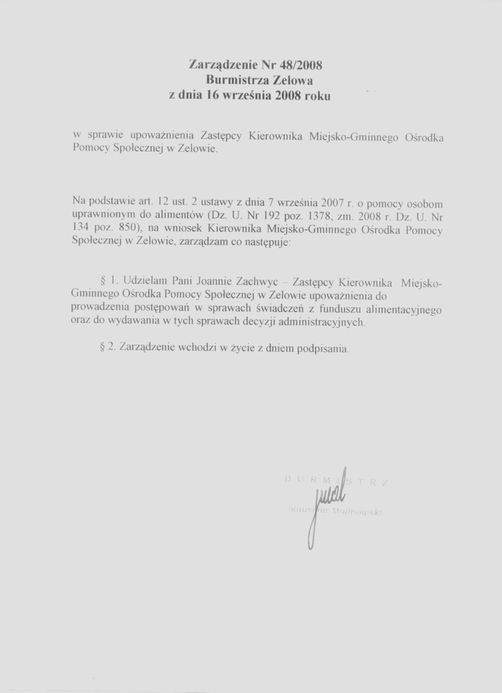 | Tytuł aktu prawnego - skrócony: | Zarządzenie w sprawie upoważnienia Zastępcy Kierownika Miejsko-Gminnego Ośrodka Pomocy Społecznej w Zelowie |