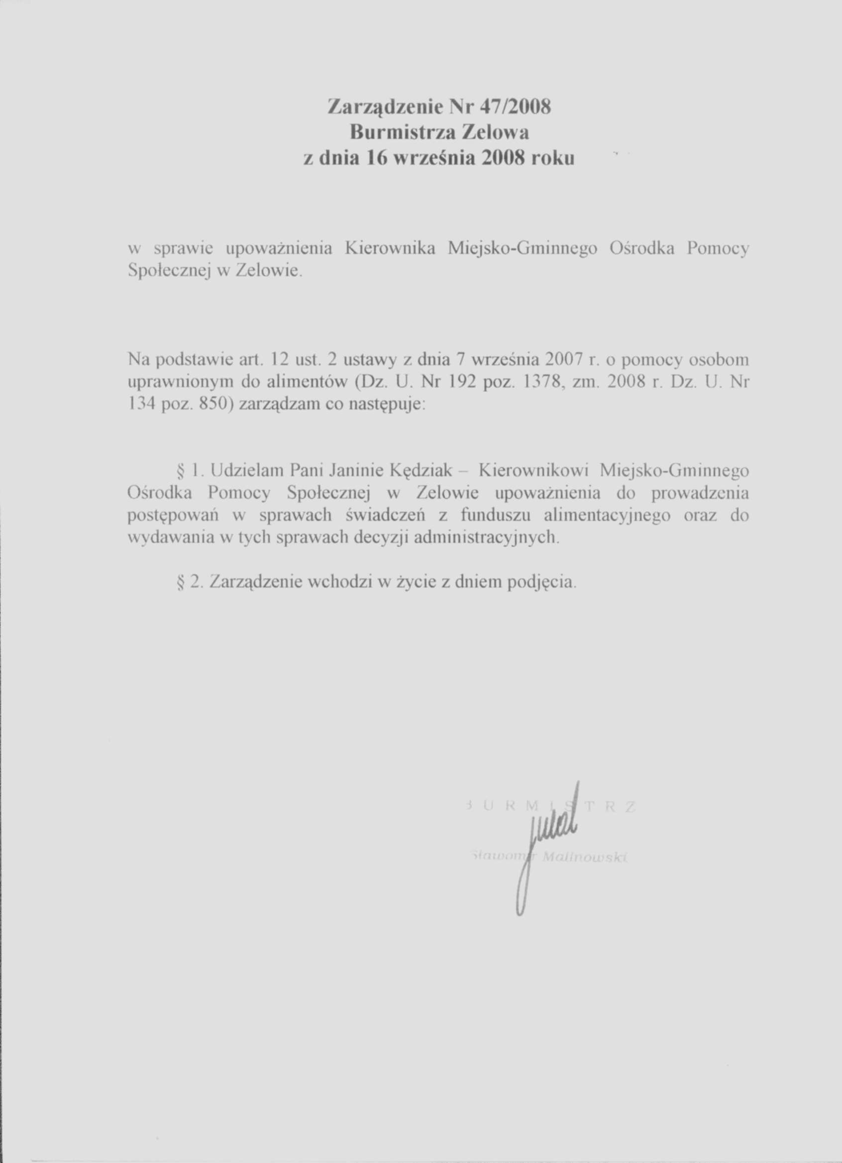 | Tytuł aktu prawnego - skrócony: | Zarządzenie w sprawie upoważnienia Kierownika Miejsko-Gminnego Ośrodka Pomocy Społecznej w Zelowie |