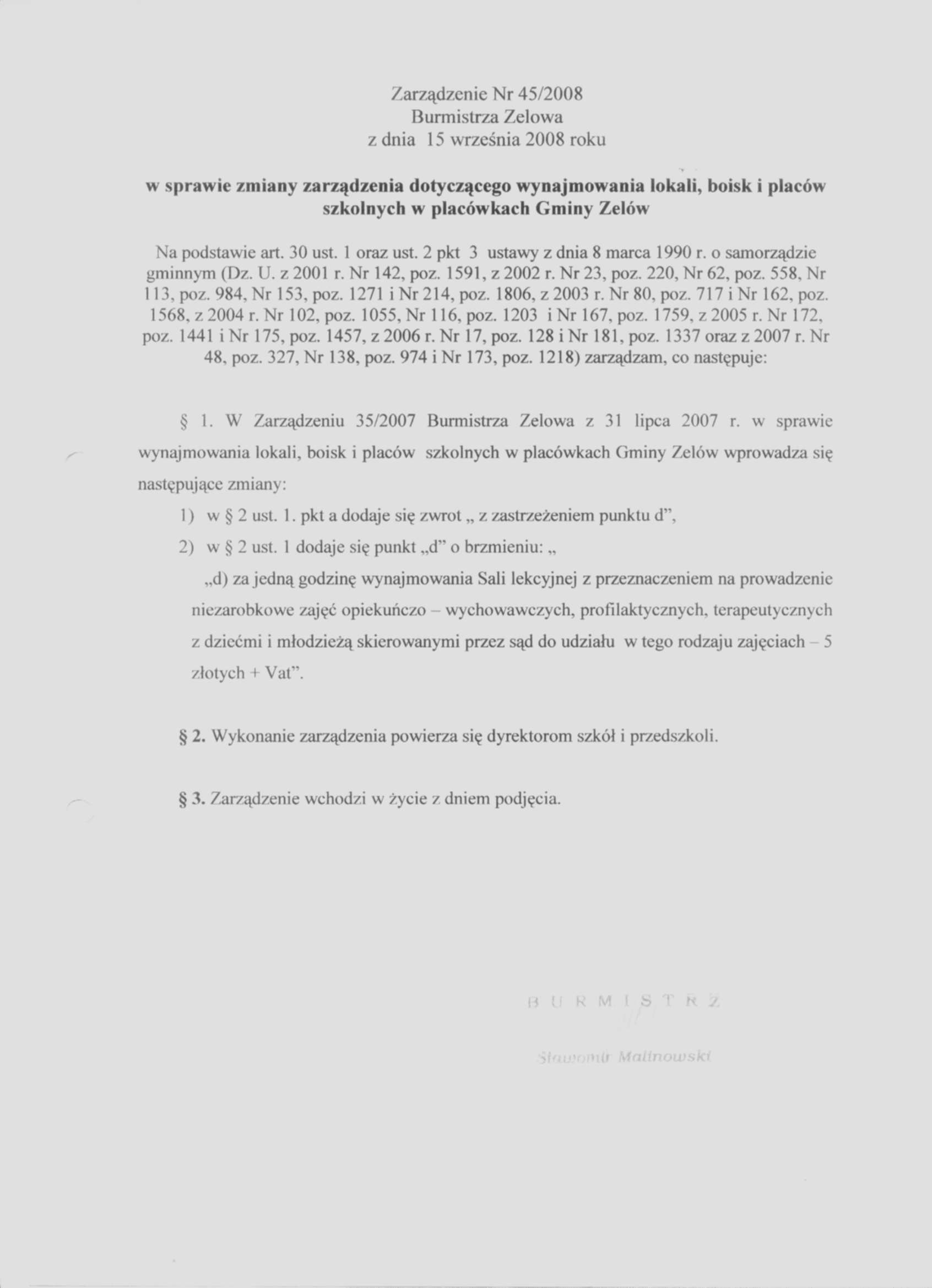| Tytuł aktu prawnego - skrócony: | Zarządzenie w sprawie zmiany zarządzenia dotyczącego wynajmowania lokali, boisk i placów szkolnych w placówkach Gminy Zelów |