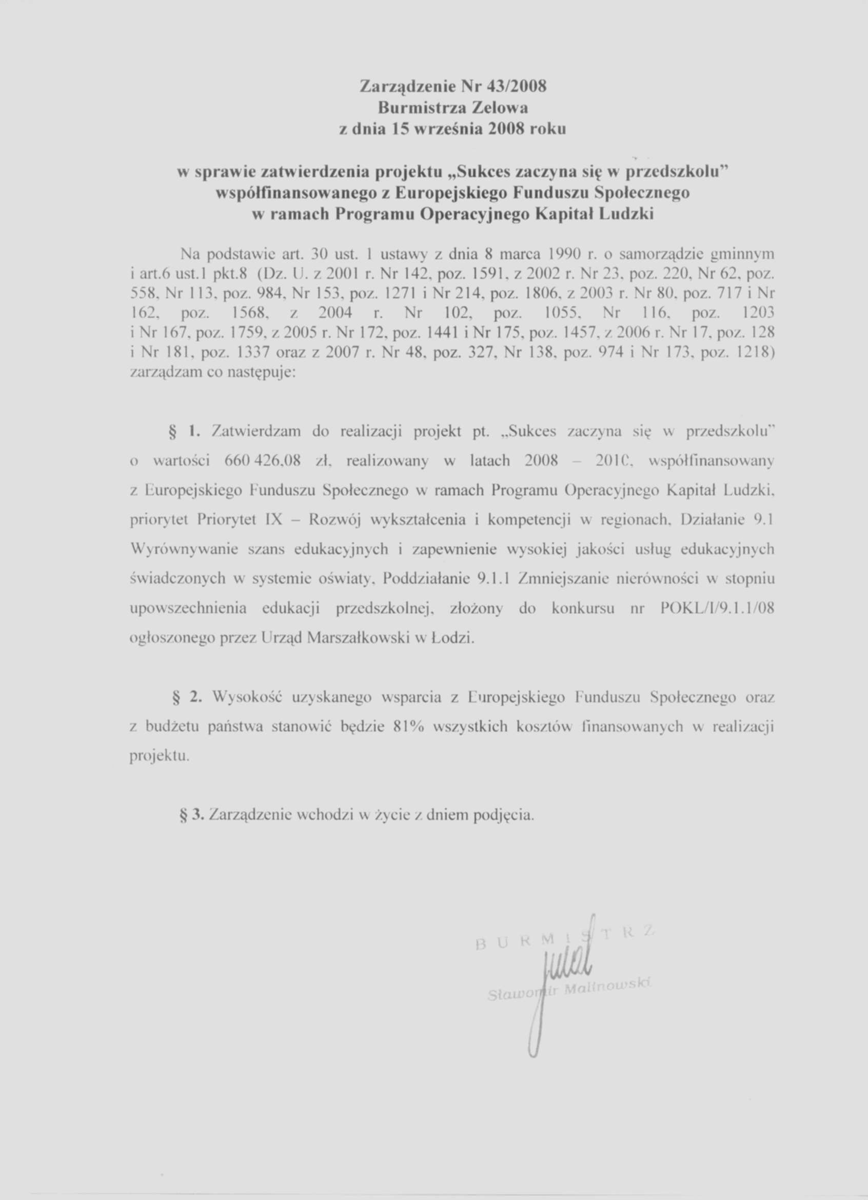 | Tytuł aktu prawnego - skrócony: | Zarządzenie w sprawie zatwierdzenia projektu "Sukces zaczyna się w przedszkolu "współfinansowanego z Europejskiego Funduszu Społecznego w ramach Programu Operacyjnego Kapitał Ludzki |