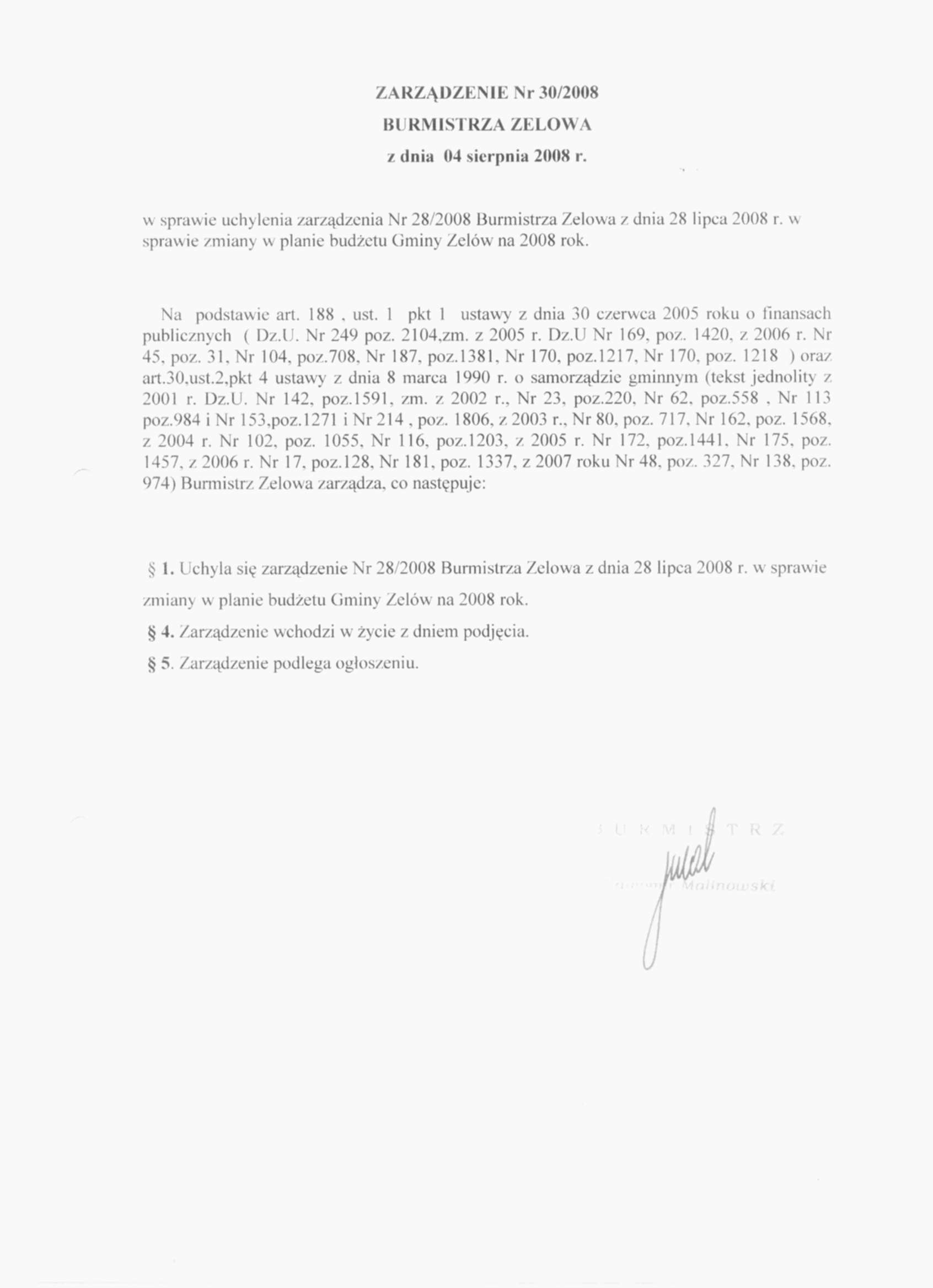 | Tytuł aktu prawnego - skrócony: | Zarządzenie w sprawie uchylenia zarządzenia Nr 28/2008 Burmistrza Zelowa z dnia 28 lipca 2008 r. w sprawie zmiany w planie budżetu Gminy Zelów na 2008 rok |