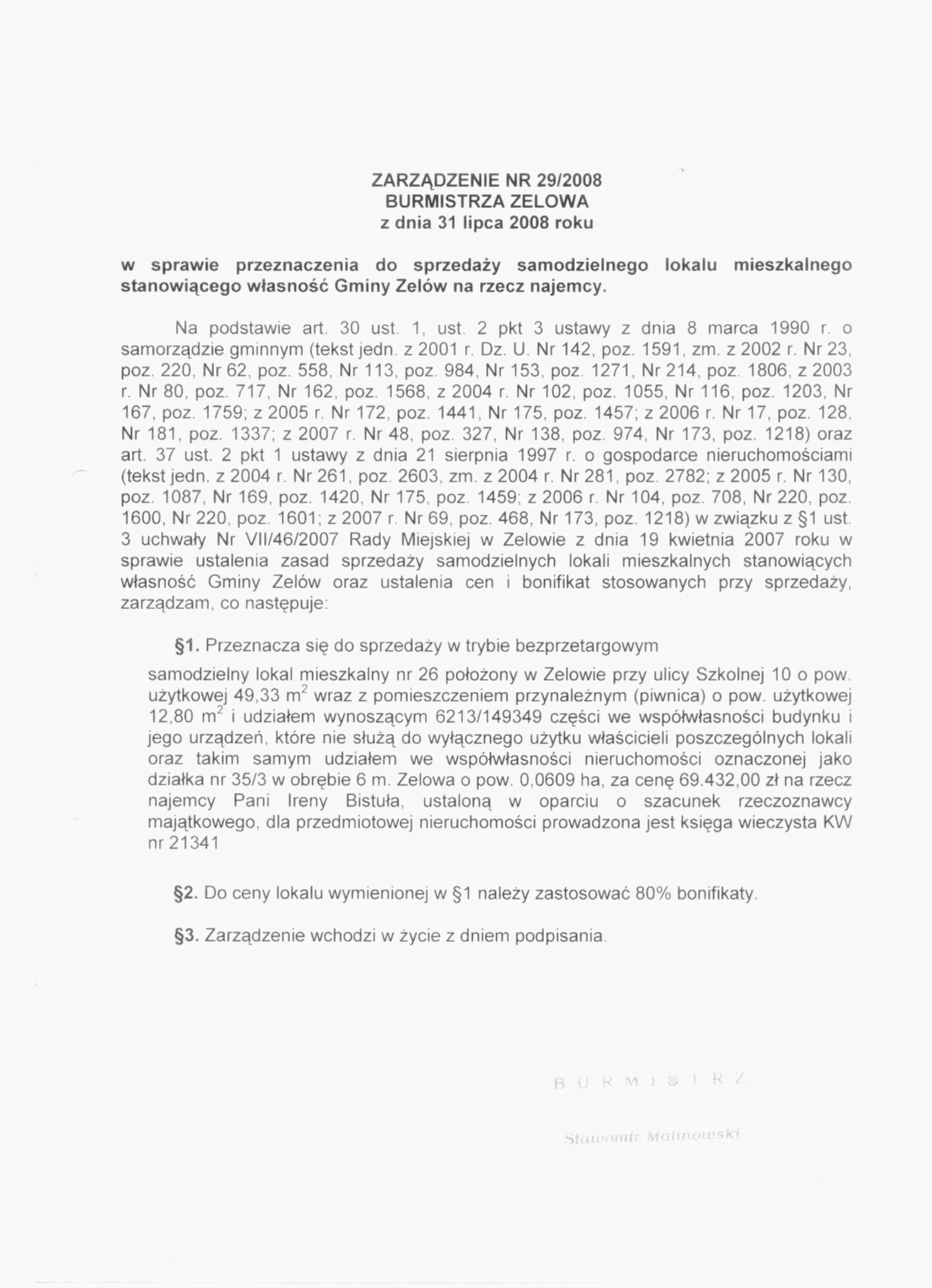 | Tytuł aktu prawnego - skrócony: | Zarządzenie w sprawie przeznaczenia do sprzedaży samodzielnego lokalu mieszkalnego stanowiacego własnośc Gminy Zelów na rzecz najemcy |